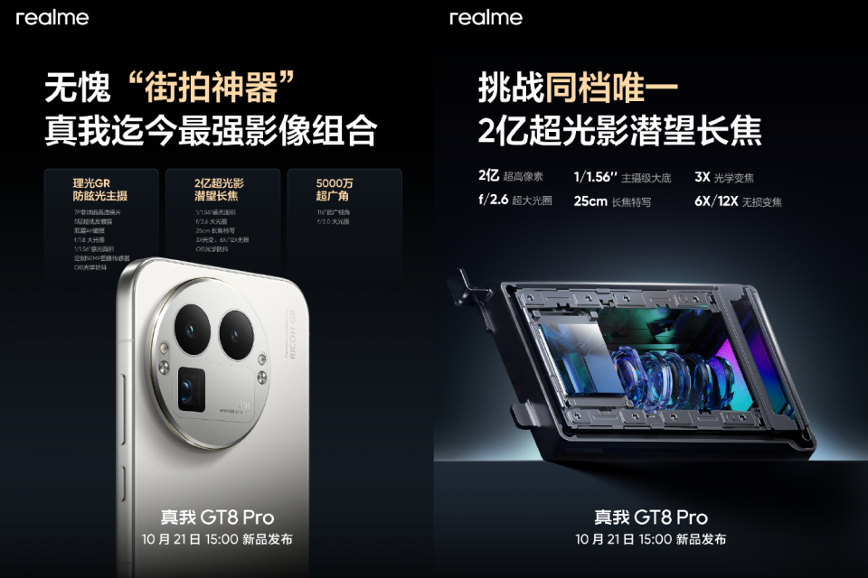 日前, @真我手机 陆续发布了两张真我GT8 Pro的影像官宣预热海报,公布了该机影像配置的详细参数,并且配文称,