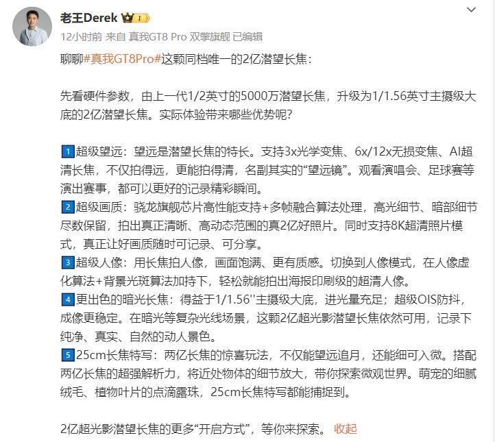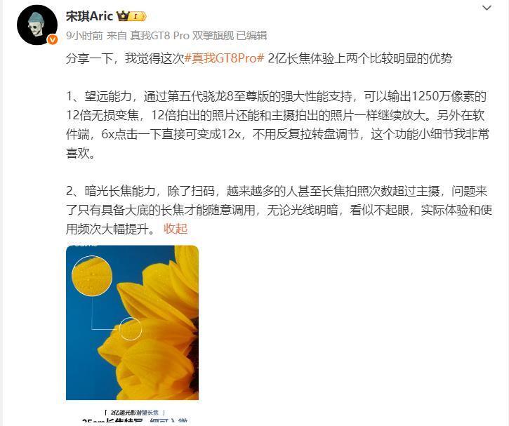 对此, @宋琪Aric 解读了2亿超光影潜望长焦的优势,据其称,“分享一下,我觉得这次#真我GT8Pro# 2亿长焦体验上两个比较明显的优势