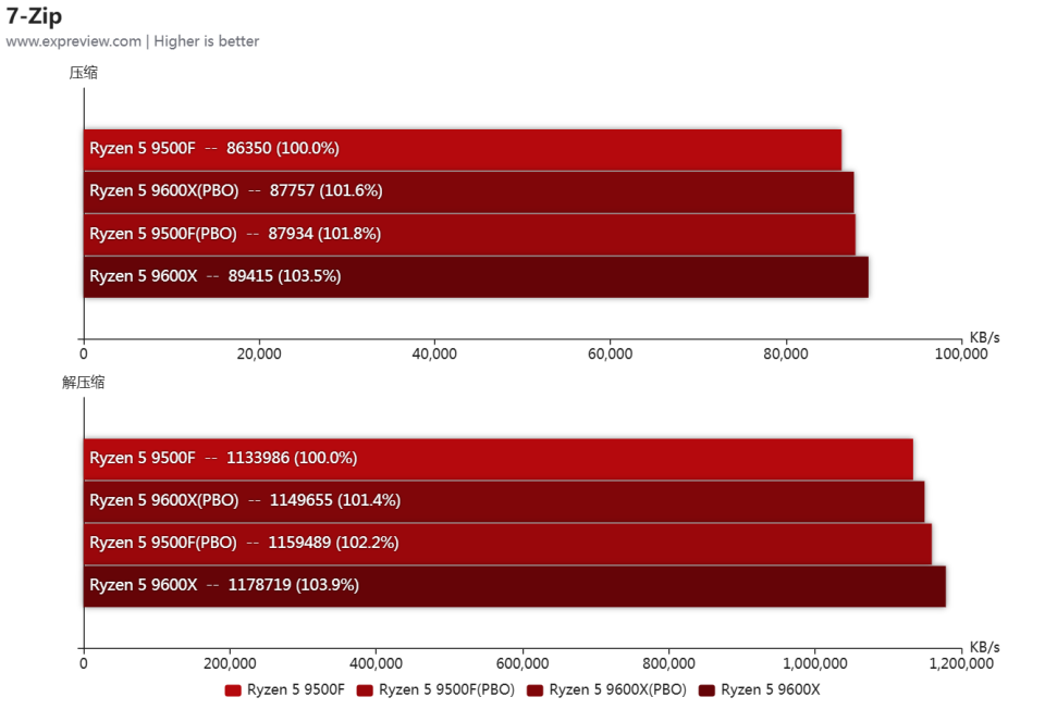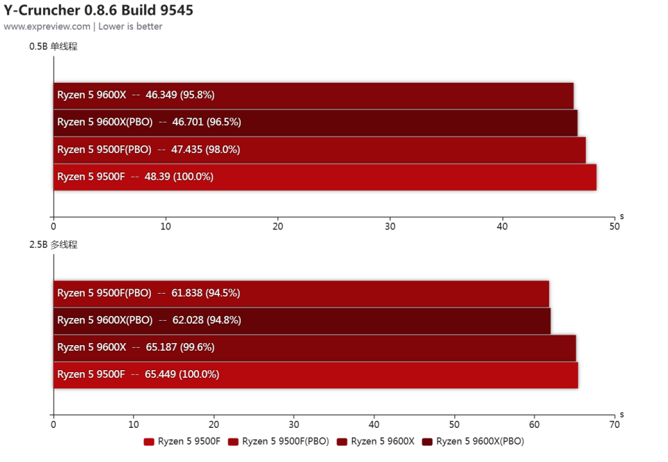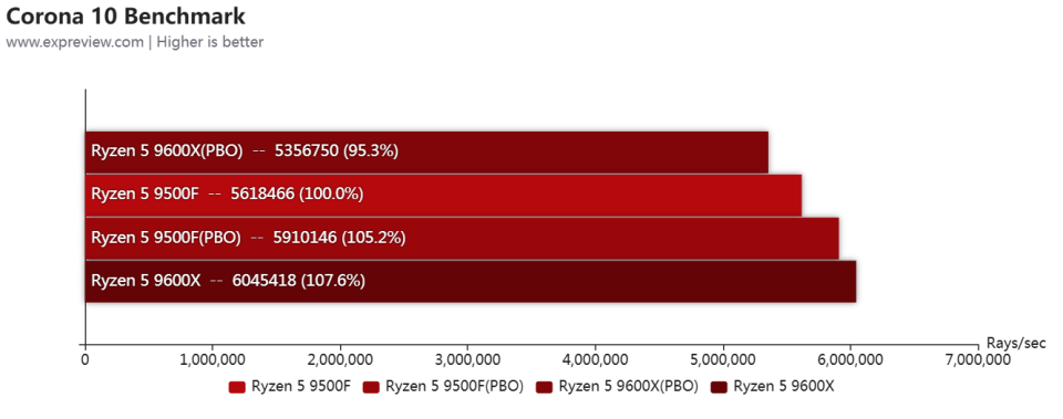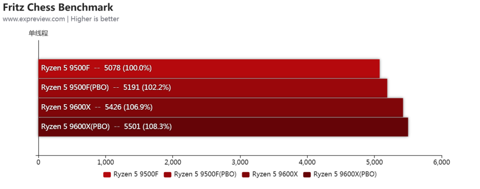 锐龙5 9500F的基准性能并无悬念,本质上是一颗降频版的锐龙5 9600X,而且性能下降并不算大,多线程性能就低了那么一点点,单线程因为最高主频的原因降幅相对多些,但也不是很大,开启PBO后性能就超过了默认的锐龙5 9600X了,当然后者也可以开PBO提升性能。