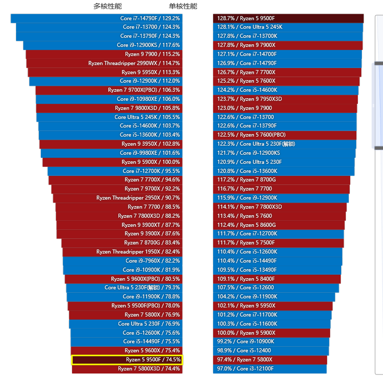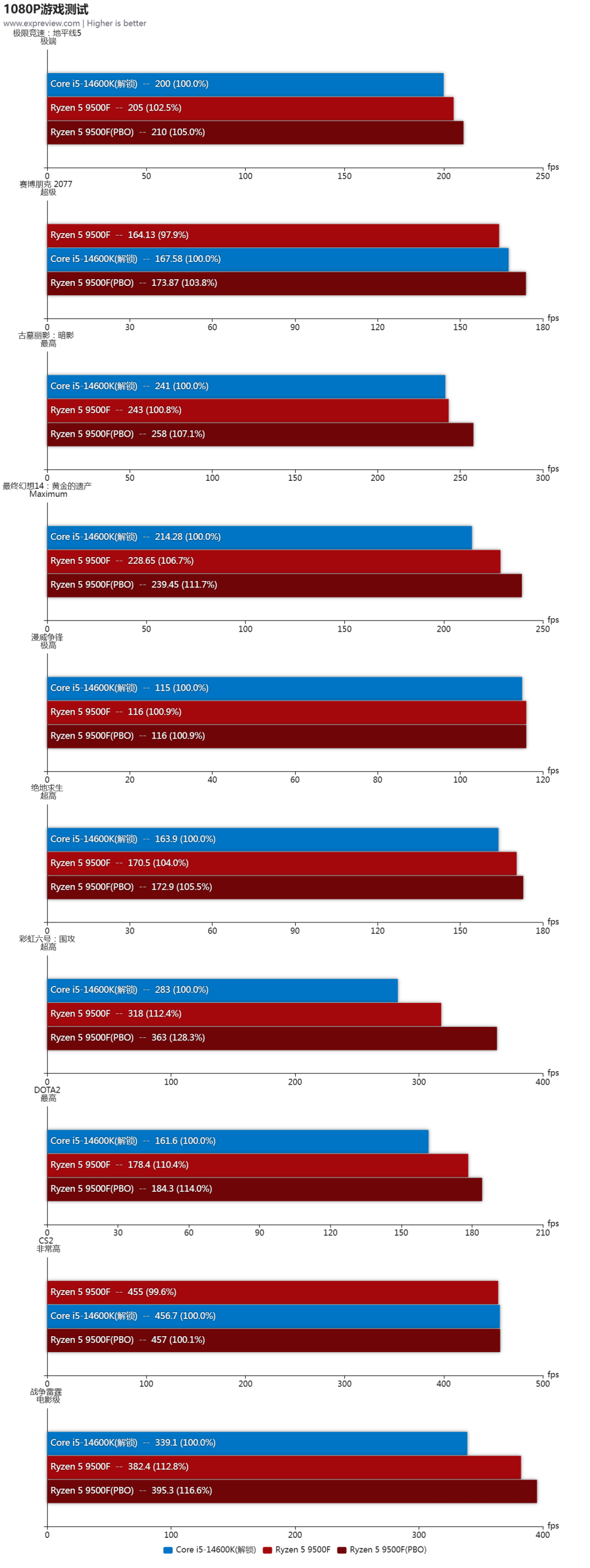 我们会测试锐龙5 9500F在默认与开启PBO后的游戏与基础性能,而酷睿i5-14600K是直接跑解锁功耗来跑测试的,解锁功耗前后其实性能也没有太大差异,所以就放一个成绩了。