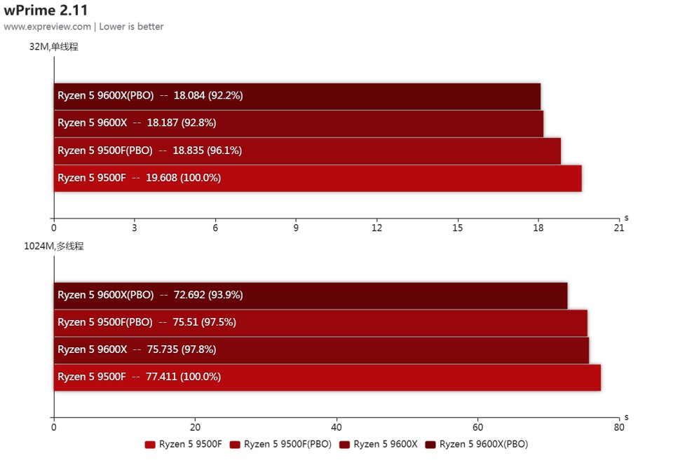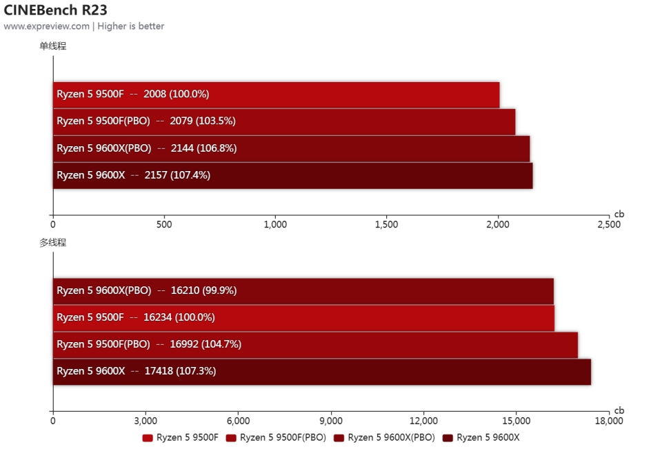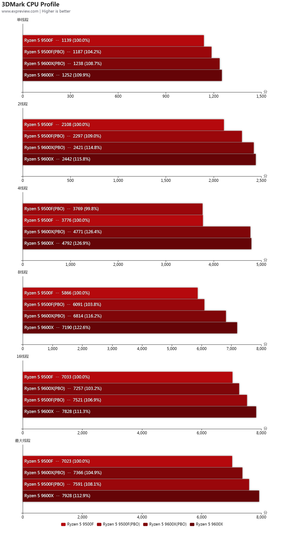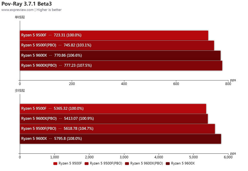 锐龙5 9500F在开启PBO后单线程性能提升了3.4%,多线程性能提升了4.7%,多线程性能超过了默认状态下的锐龙5 9600X,当然了和开了PBO后的锐龙5 9600X还是有些差距,以下是具体测试数据。