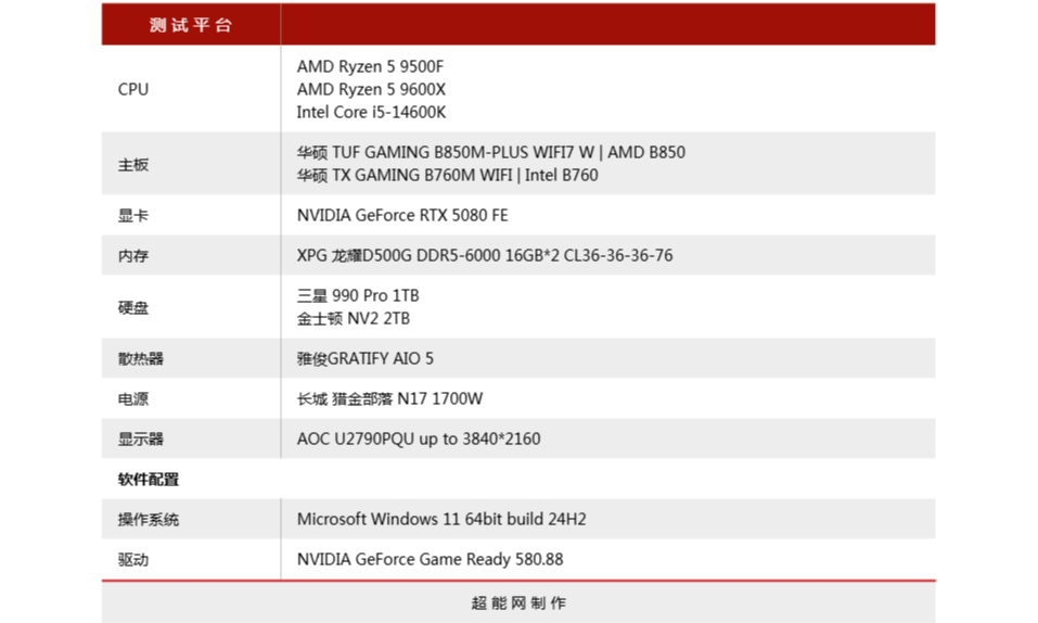 锐龙5 9500F搭配的主板是华硕TUF GAMING B850M-PLUS WIFI7 W,而酷睿i5-14600K则使用华硕 TX GAMING B760M WIFI主板,搭配的内存则是XPG 龙耀D500G DDR5-6000 16GB*2 CL36套装,测试游戏所使用的显卡是RTX 5080 FE,其他配件包括雅俊GRATIFY AIO 5一体式水冷散热器,长城猎金部落 N17 1700W电源。