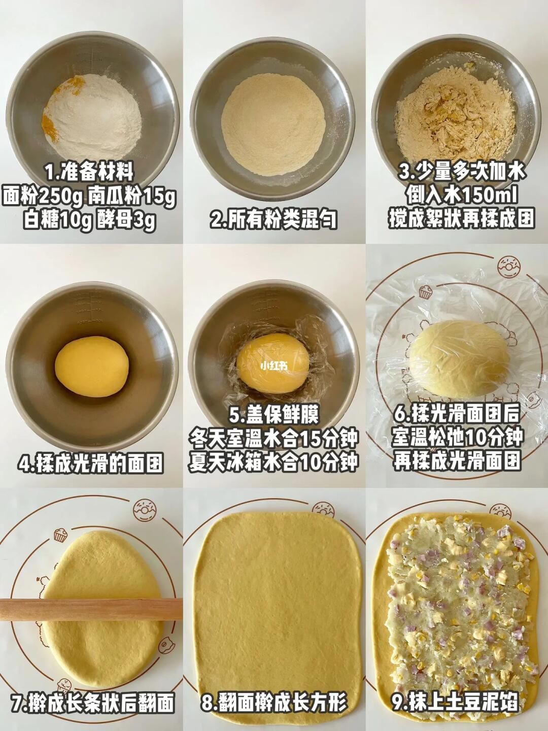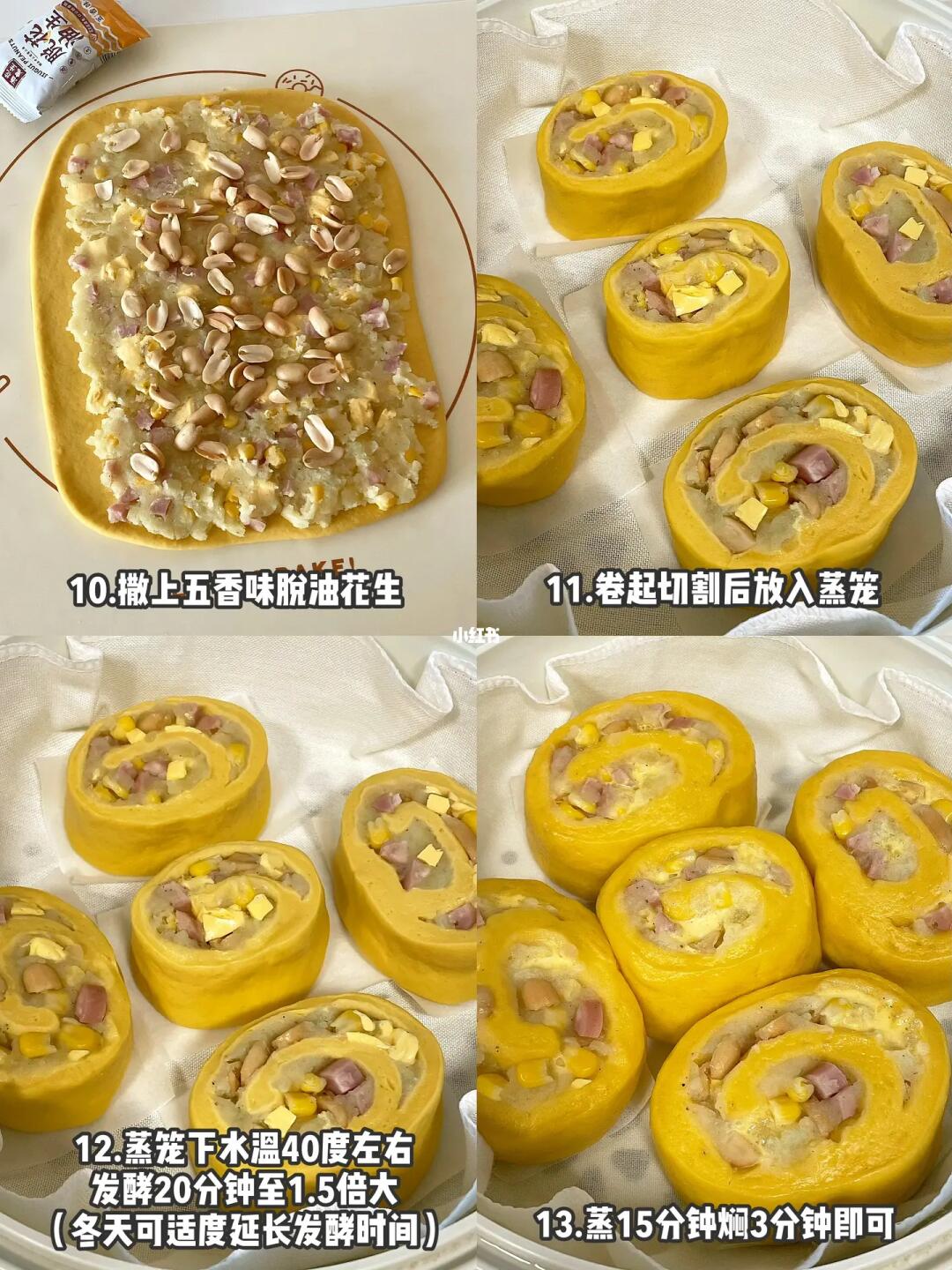 4️⃣抹上土豆泥馅,再撒上五香味的脱油花生,然后卷起用刀切割(我做了八个)。