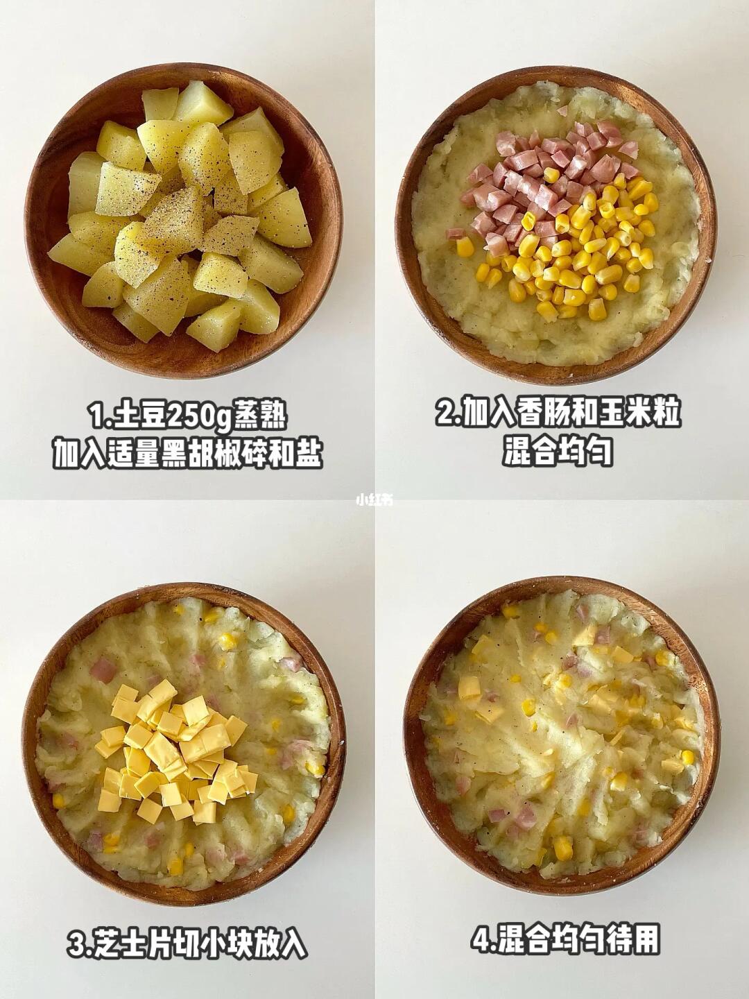 2️⃣期间蒸土豆,土豆蒸熟后撒适量盐和黑胡椒压泥,冷却后加香肠、玉米粒和芝士片。