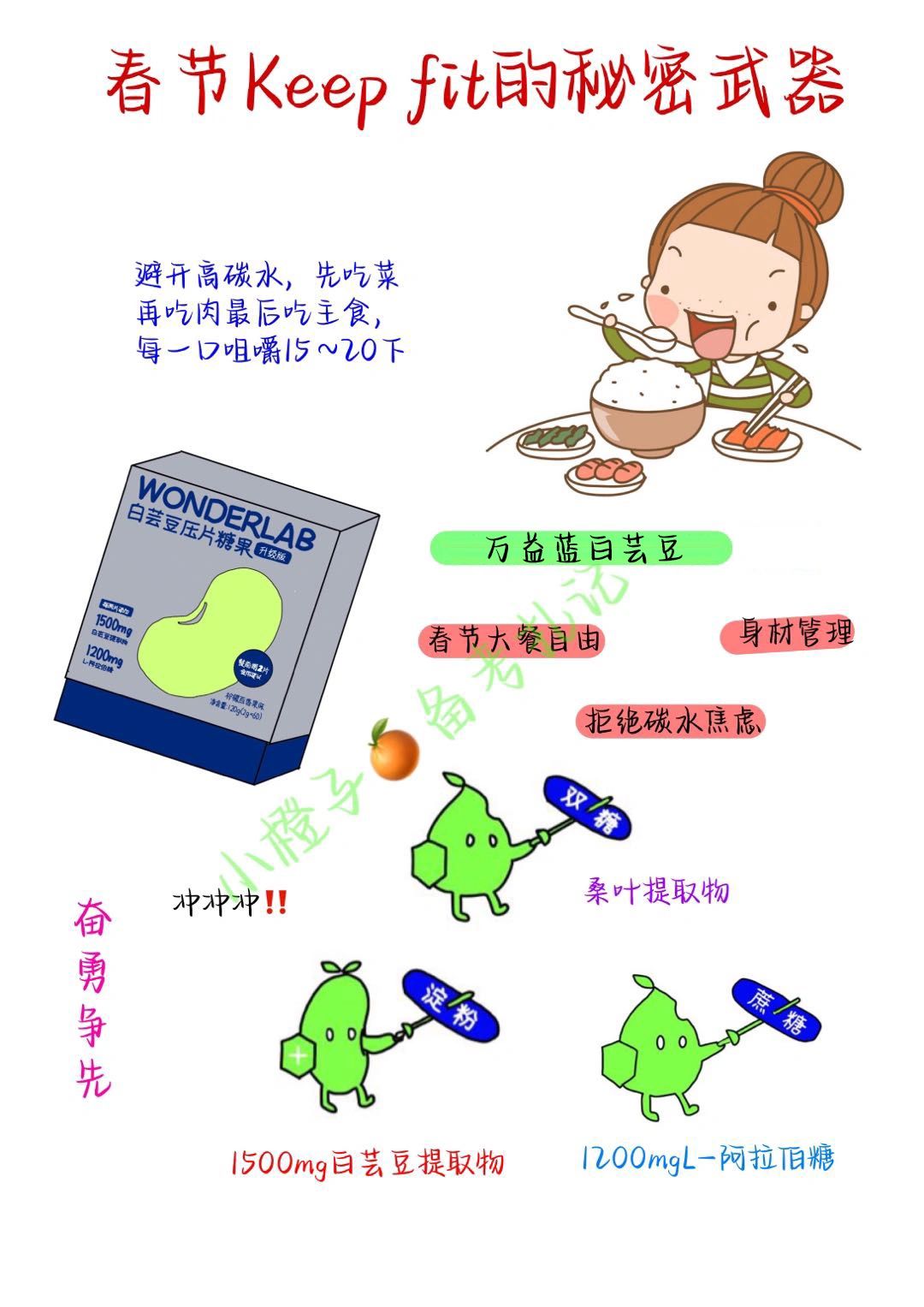 📣姐妹们‼️姐妹们‼️ 今天小橙子🍊分享的是春节自救指南✅ 牢牢守住S码‼️ 每逢佳节胖三斤❓ 过年各种局,如何吃不胖❓ 吃好喝好,还能体重管理❓ 那些你看不到的碳水才是变plus的罪魁祸首[捂脸R] [红色心形R]高碳水:薯条、糕点、饺子、红薯、油条等 [绿色心形R]低碳水:牛肉、坚果、鸡蛋、西蓝花、生菜等 春节Keep ft的秘密㊙️武器👇公主请查收✅ 1⃣️秘密武器一 避开高碳水,先吃菜再吃肉最后吃主食,每一口咀嚼15~20下 2⃣️秘密武器二 春节将至,难免各种聚会,大吃大喝,要怎么吃才能拒绝碳水焦虑,吃喝自由❓ 不如试试这个万益蓝白芸豆,每2片就添加了1500mg白芸豆提取物+1200mg阿拉伯糖,双层夹击,针对淀粉和蔗糖。还特别添加了海藻粉、绿咖啡粉,强强联合。年底各种聚会前来2片,火锅串串大餐终于不再是问题啦[赞R][赞R][赞R] 味道是酸酸甜甜的柠檬百香果味,小小的一盒就能吃一个多月, 春节想要身材管理的姐妹真的可以试一试[哇R][哇R][哇R] ............................................ 🌈下期再见啦