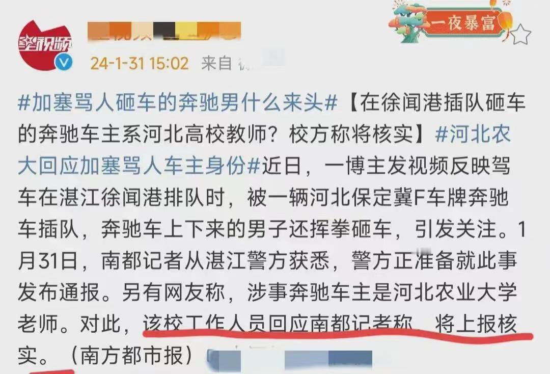 曝光奔驰男的是一位网红奶奶,河北农大也将核查奔驰男身份 “前后能差一分钟吗?”“撞!在撞!”“你真是一个大xx”。说完这些话这位奔驰男是泄气了,但他不会想到这一幕都被对方拍摄了下来。更不会想到的是,对方还是一个网红。 事情是这样的,1月29日,广东湛江徐闻一位有七十多万粉丝的网红奶奶,驾驶着奇瑞准备排队上船。但却因为排队的事情,和边上一辆奔驰车产生了争执。随后这位奔驰车主气不过就将其逼停,然后下车进行了一顿语言输出。并且为了撒气,还用手砸了几下车的引擎盖,把引擎盖都给砸出了印子。 而这一切,都被这位71岁网红奶奶的孙女给拍了下来,随后上传到了她的账号上。因为其账号影响力很大,这个视频很快就传遍了网络,让大家都看到了这奔驰男没有素质的一幕。并且也惊动了徐闻的警方,将其行政拘留十日,并罚款500元。 这事情一发到网上,那肯定会产生所谓的网暴或者人肉。这不有网友就找到了河北农业大学之前分享的扫雪视频。从视频中找到了这位奔驰男,所以大家认为这奔驰男就是学校的一名老师。甚至还有可能是领导。 而对于这件事情,河北农业大学的工作人员也表示会将这件事上报,从而进行核实。如果是真的话,那这位奔驰男可能还要受到学校的处罚。 而这件事也惊动了奇瑞的法务,奇瑞法务表示已经飞往了海南,去协助这位网红奶奶处理这件事情。并和大家表示,他们奇瑞的法务不是吃素的。在事情解决之后,这位网红奶奶还发视频感谢了奇瑞。
