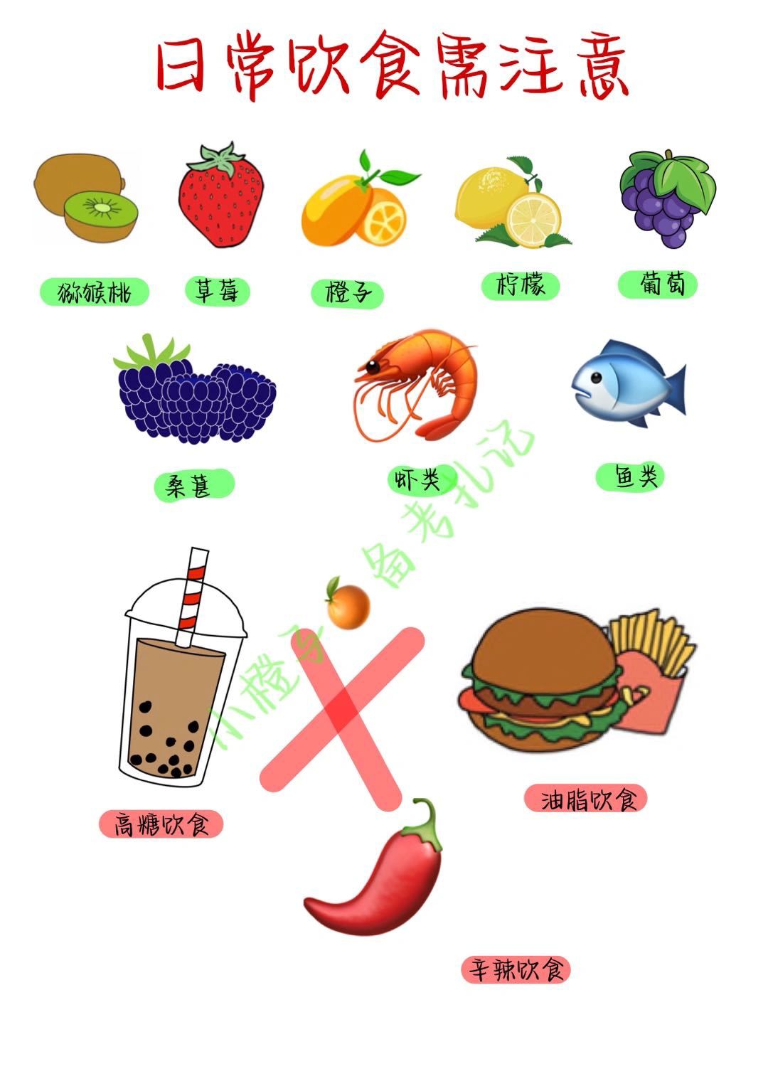另外我们的日常饮食也需要注意 ,多吃富含维生素C、虾青素等食物,高糖、油炸、辛辣饮食要节制!