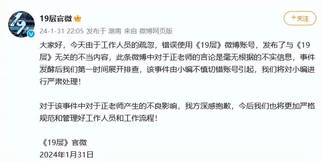 网剧官博公开骂于正心眼小做烂剧,事后道歉称小编切错号 1月31日,网剧《19层》官方微博公开发文骂于正心眼小,做烂剧,瞬间就上了热搜。 因为如果是普通网友骂一骂,这个还能理解。但一个官方微博突然发文骂于正,这就让人有点感觉太过了。并且这官方微博还叫娱乐圈的漂亮姐姐都去远离于正,说于正为了吸血不择手段,烂剧做多了就成天幻想自己娱乐圈总裁只手遮天。 但到了深夜的时候,这个网剧官方微博就发文为这件事道歉了。并表示骂于正并不是他们的意思,是他们的小编评论的时候切错账号了,并且已经对这个小编严肃处理了。这就看来,是这个网剧的小编讨厌于正,才跑去骂于正的。 而于正看到之后也没有生气,反而帮这部网剧做了一下宣传。并表示年轻人难免会被舆论引导,他年轻的时候也是这样。所以就不必要处理那个小编了。并表示经过这件事之后,这个小编肯定会更加谨慎。最后于正告诉大家都散了吧,一切就从我的挨骂结束吧。 感觉于正最近的一些舆论,都是自己的新剧《五福临门》换女主角一事。就是不知道这部剧到时候拍完上映之后,能不能改变一下观众们的看法了。