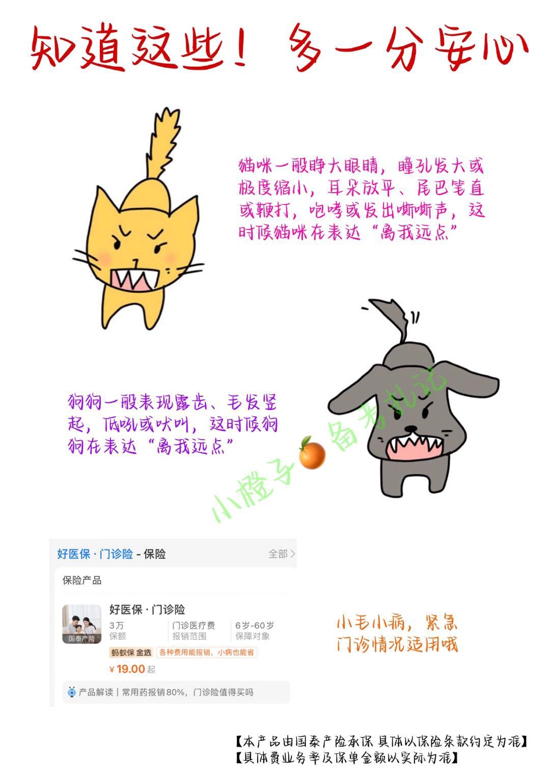 📣📣📣姐妹👭们‼️姐妹👭们‼️ 今天小橙子🍊分享的是关于我撸猫这件事儿‼️给自己的安全感🙋 [哇R]一时撸猫一时爽,一直撸猫一直爽[哇R] 每次心里疲惫的时候,揉揉猫咪毛茸茸的脑袋,摸一摸猫主子那可爱的jio jio,看小猫咪温柔的翻身躺倒在你脚下,露出它温暖的小肚皮,心里所有的疲惫都会被治愈。 但是在相处的过程中,也会有小摩擦的发生,被猫咪咬伤或者是抓伤的情况[哭惹R][哭惹R][哭惹R] 以下紧急处理方式✅公主请查收👇 ⭐️第一步 查看伤口咬伤程度,首先用力,挤压伤口,尽可能排出污🩸 ⭐️第二步 彻底清洗伤口:被咬伤后彻底清洗伤口,可用肥皂搓洗伤口,流动水冲洗,减少🦠残留量 ⭐️第三步 用碘酒认真消毒伤口,除伤口大且伤及血管需止🩸外,无需包扎 ⭐️第四步 尽早到正规🏥注射狂犬疫苗,说到打狂犬疫苗,一打就是5针,花费还挺贵 ,医保都不能报xiao的,但是该打就要打的,不能大意,所以我半年前就在朋友的推荐下投保了ZFB上的好医保门诊险。给危险按下暂停键。 像这种宠物抓咬伤、食物中毒、意外骨折等门诊就医费用,不限医bao内外,能够赔付70%。像之前不小心被小橙子🍊抓到,就用上了这个保xian,报xiao了800块左右呢[赞R][赞R][赞R] 除了线下看门诊可以用,也可以直接24h保单线上咨询大白哦,💊还可以直接送上门,真的巨方便快捷! 每个月一杯奶茶钱让自己多一份保障,性价比非常高[哇R][哇R][哇R] 在日常生活中,再怎么喜欢宠物,也要了解他们的一些表现哦(请看图5)知道这些,给自己的安全感👍 ……………………………… 🌈下期再见啦