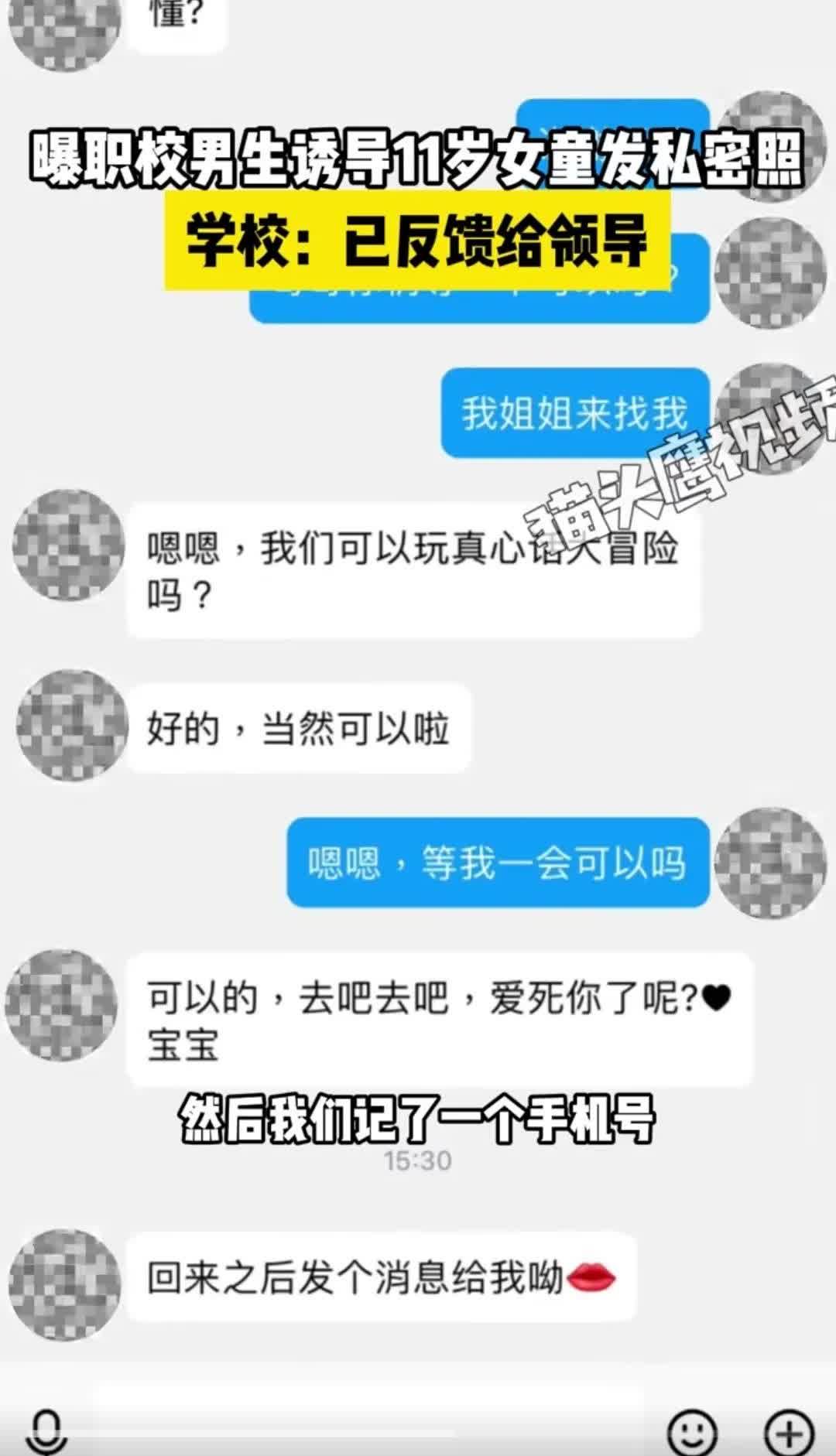 1月31日,一位网友曝光了一段聊天记录,记录显示一名自称临沂职业学院的男学生诱导一位11岁的女童发送私密照片。2月2日,学院工作人员回应称已经向领导反馈,并等待处理结果。此事件引发了网友的热议,一些人认为少男少女之间的性萌动是正常的成长过程,不应该过度解读。现在,请你发表意见。 友友们,你们怎么看?