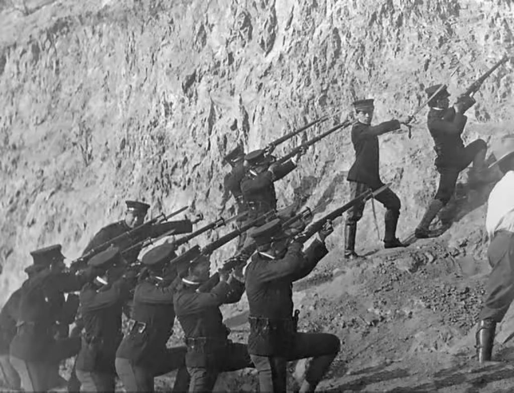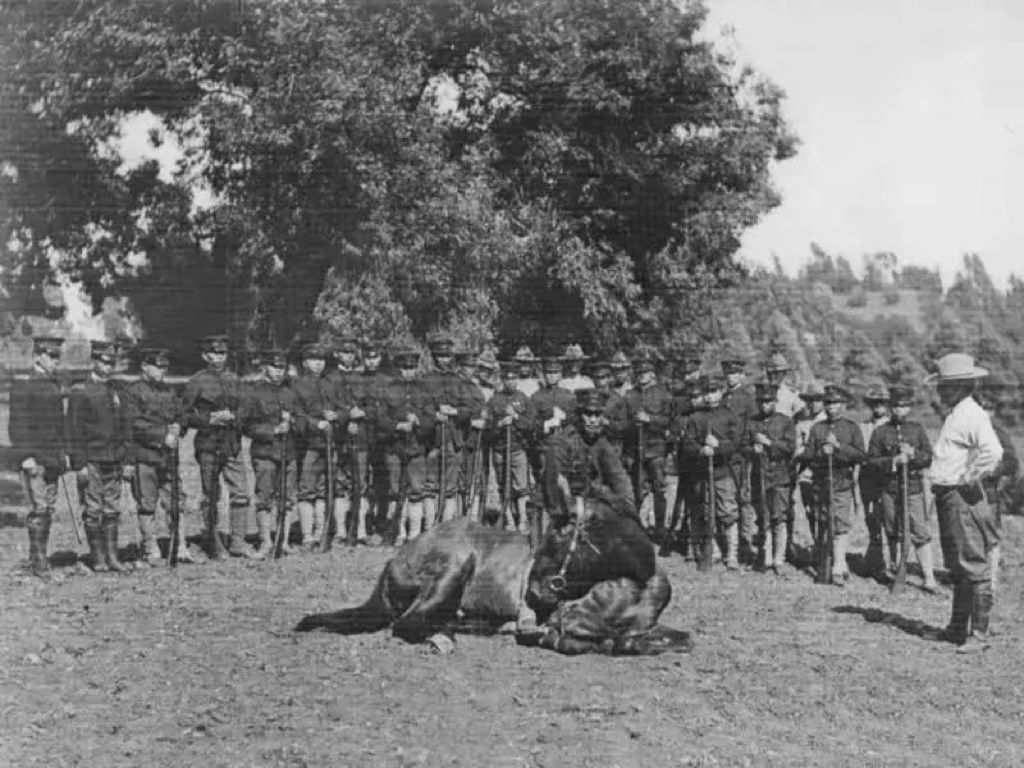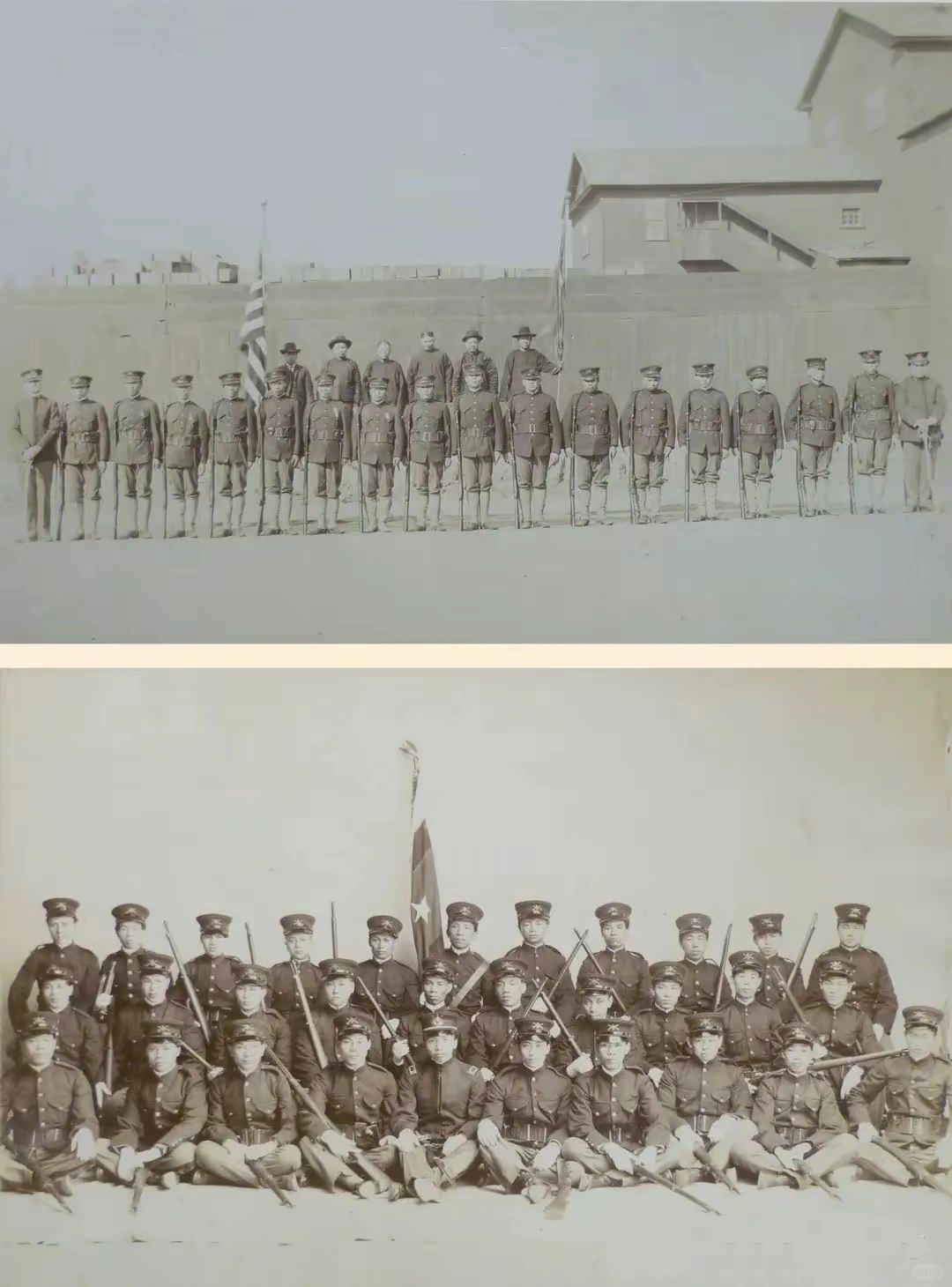 训练中的“维新军”,加州鹰岩(Eagle Rock, CA),1904— 1905 年。1899 年,康有为在美国成立“保皇会”,亲任总会长,梁启超任副会长。美国人荷马李(Homer Lea, 1876—1912)支持康梁保皇活动,被康有为封为“大将军”。1904 年11 月,荷马李在洛杉矶成立了“西方军事学校”,为康有为、梁启超保皇党的“维新军”提供军事训练。