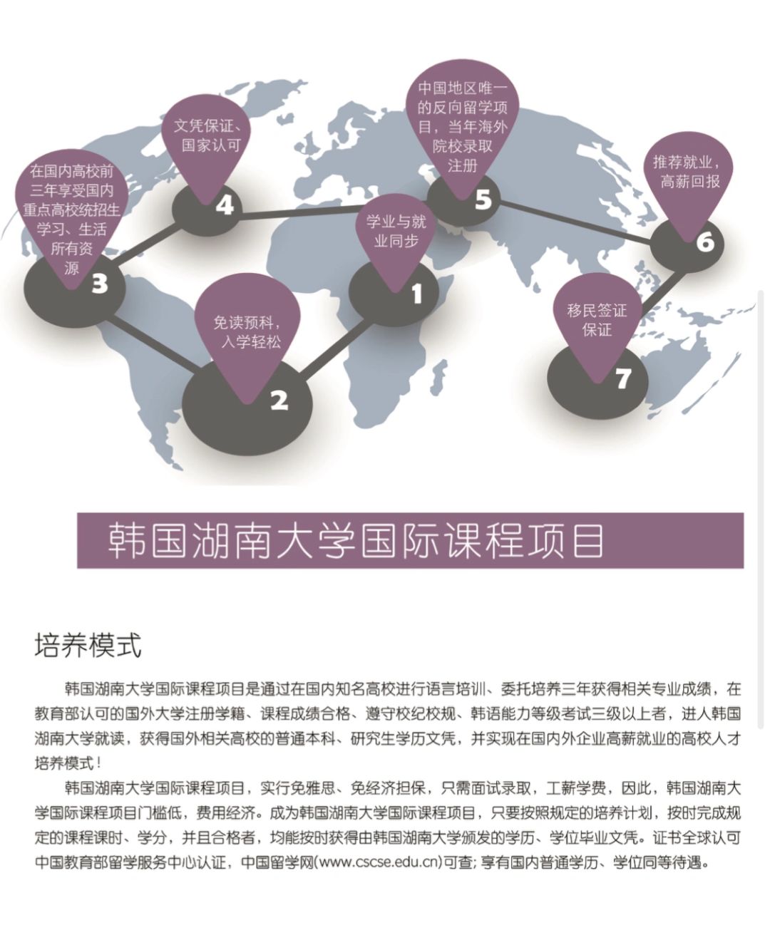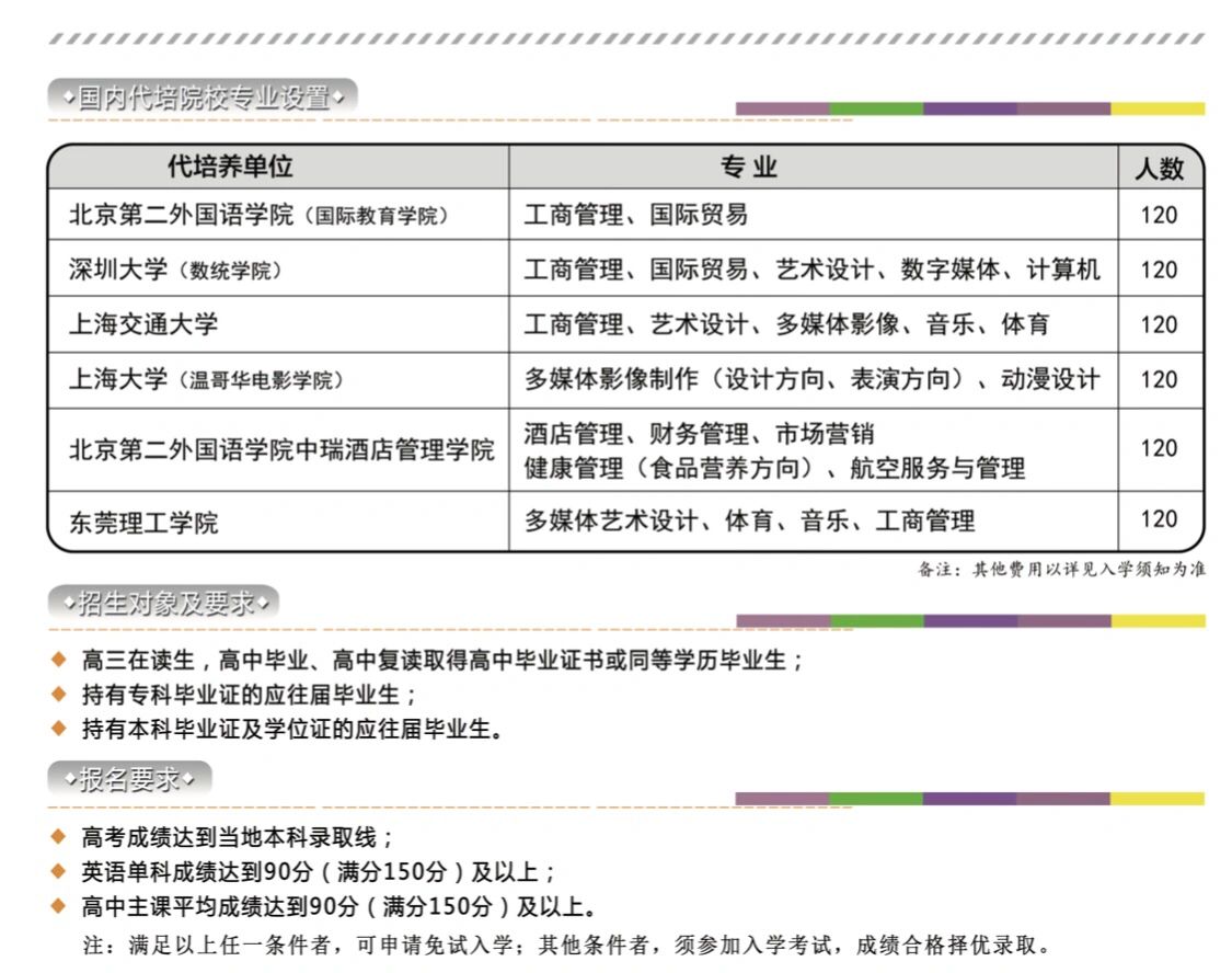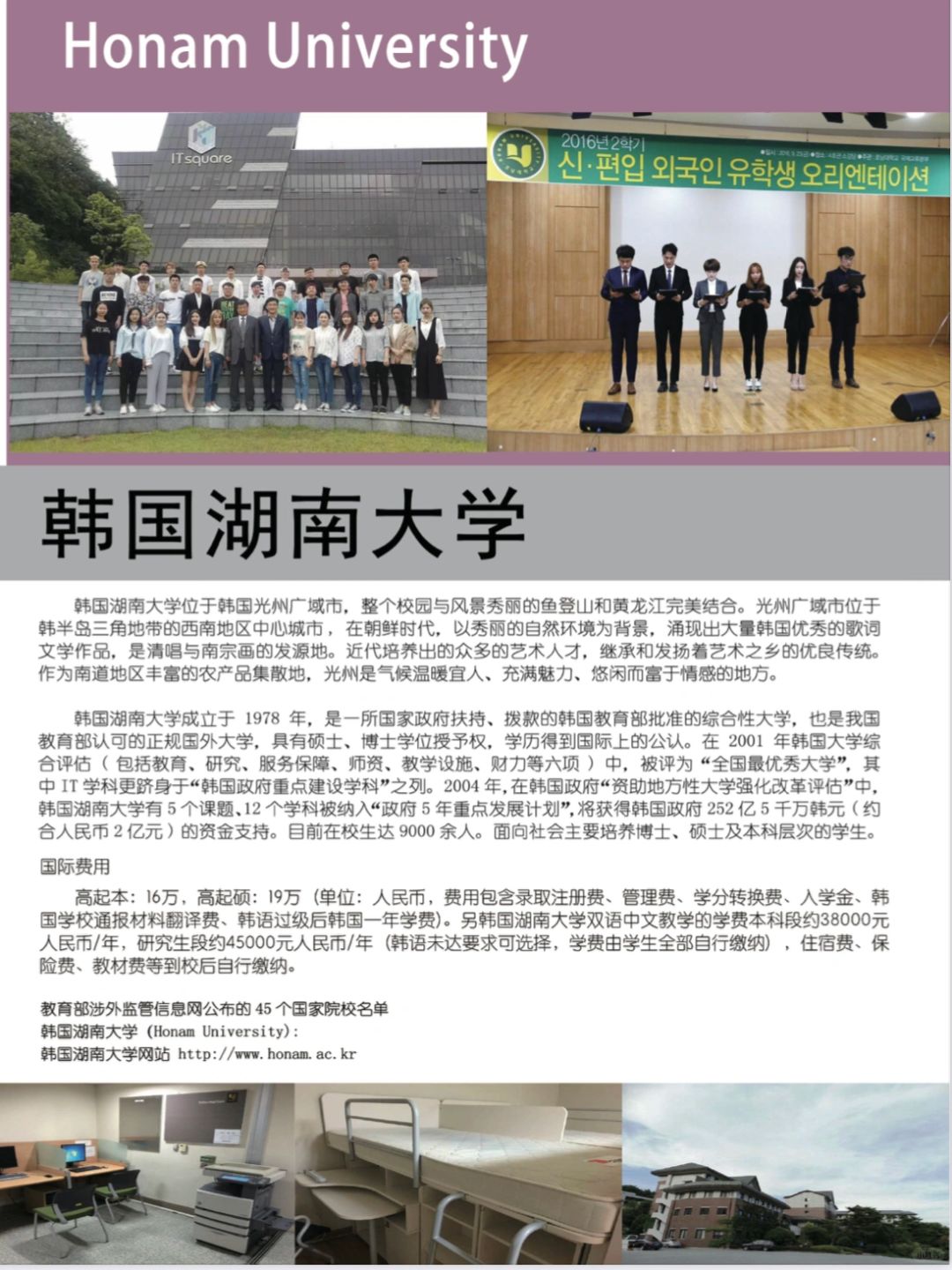 韩国湖南大学🌈国际课程📚选拔招生简章🎉 🥳韩国湖南大学位于韩国光州广域市🌇整个校园与风景秀丽的🧚鱼登山和黄龙江完美结合。光州广域市位于韩半岛三角地带的西南地区🥰中心城市在朝鲜时代,以秀丽的自然环境为背景通现出大量韩国优秀的歌过文学作品📒是清唱与南宗画的发源地。🌊近代培养出的众多的艺术人才,继承和发扬着艺术之乡的优良传统。😇作为南道地区丰富的农产品集散地,光州是气候温暖宜人、充满魅力、悠闲而富于情感的地方 韩国湖南大学成立于 1978 年是一所国家政府扶持、拨款的韩国教育部批准的综合性大学🏫也是我国教育部认可的正规国外大学😘具有硕士、博士学位授予权🌟学历得到国际上的公认。在 2001 年韩国大学综合评估( 包括教育、研究、服务保障、师资、教学设施财力等六项 ) 中,其IT 学科跻身于“韩国政府重点建设学科”之列。 培养模式 韩国湖南大学国际课程项目是通过在国内知名高校进行语言培训委托培养三年获得相关专业成绩,在教育部认可的国外大学注册学籍课程成绩合格📄遵守校纪校规韩语能力等级考试三级以上者,进人韩国湖南大学就读获得国外相关高校的普通本科研究生学历文凭,并实现在国内🤗外企业高薪就业的高校人才培养模式! 代培养单位 ✅北京第二外国语学院工商管理、国际贸易 ✅深圳大学(数统学院)o工商管理、国际贸易、艺术设计数字媒体、计算机 ✅上海交通大学:工商管理艺术设计、多媒体影像、音乐、体育 ✅上海大学(温哥华电影学院):多媒体影像制作(设计方向、表演方向) 、动漫设计 ✅北京第二外国语学院中瑞酒店管理学院:酒店管理、财务管理、市场营销📈 健康管理(食品营养方向)、航空服务与管理 ✅东莞理工学院:多媒体艺术设计🎉体育、音乐🎶工商管理
