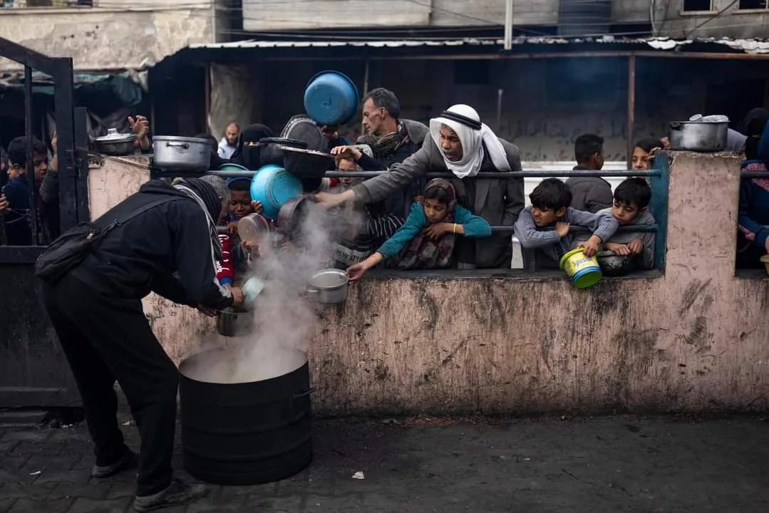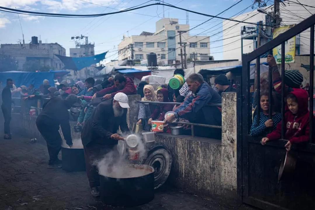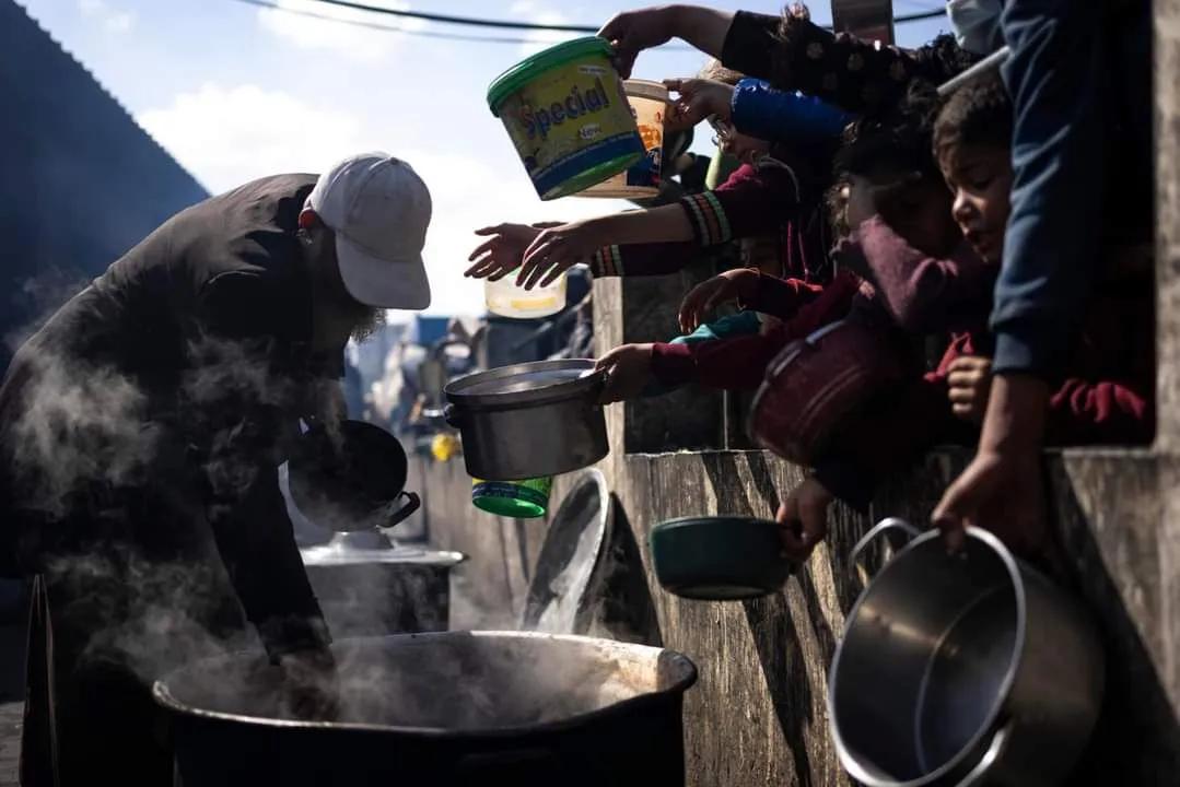 美联社照片: 在加沙地带以南的拉法,饥饿的巴勒斯坦人排队领取免费餐食。 国际援助机构表示,由于以色列的侵略,加沙地带的食品、药品和其他基本物资已经严重短缺。。(信息来源推特)