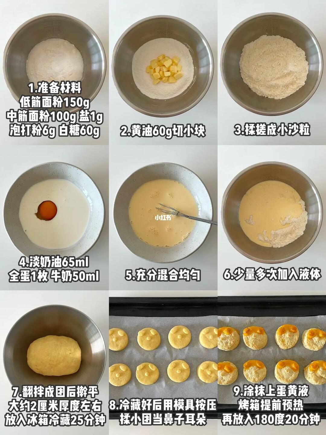 3️⃣冷藏好后用5.5cm圆形模具切好后,再用剩余面团做鼻子耳朵,可蘸取少许水方便粘合。