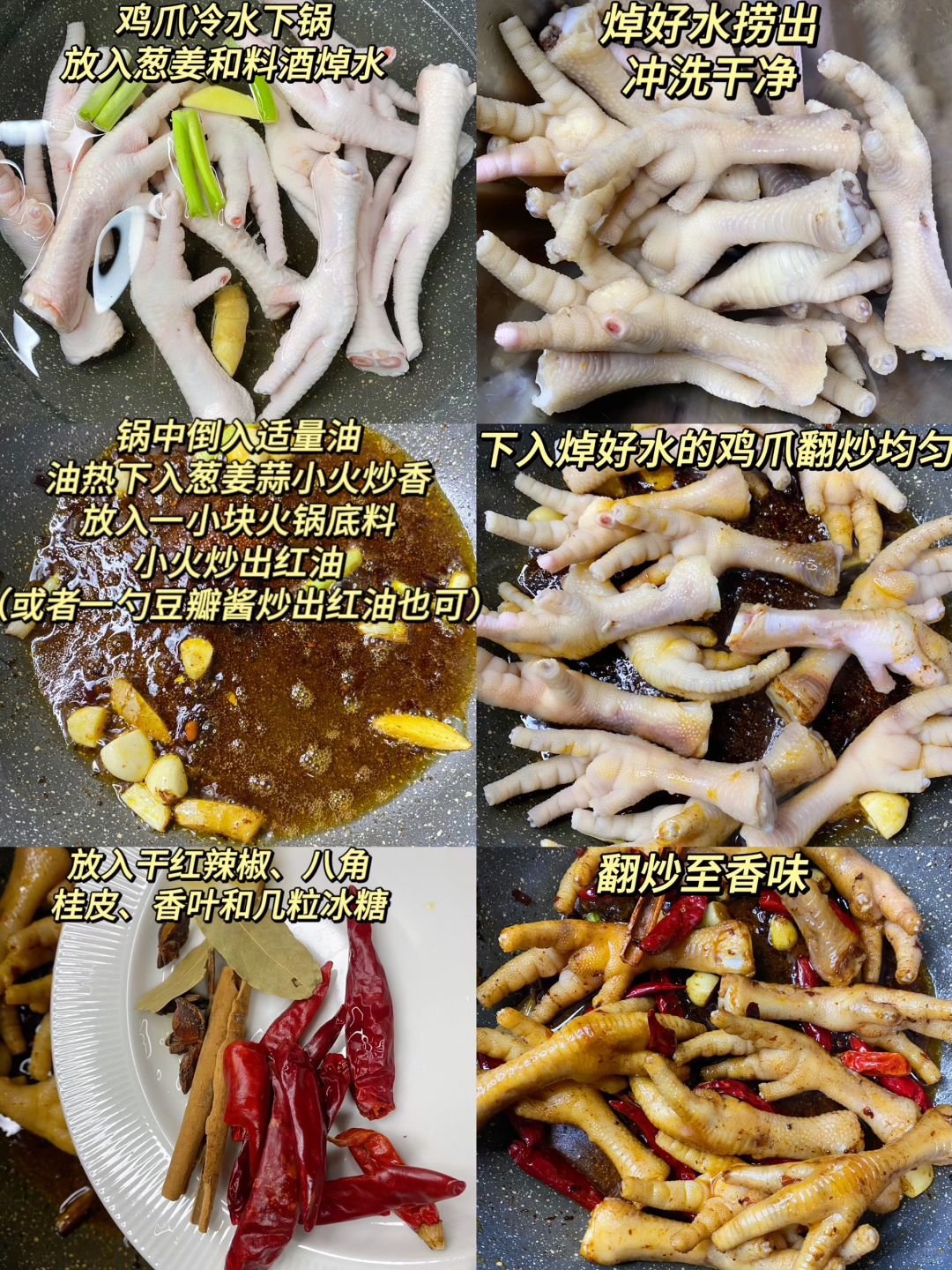 3、锅中倒入适量油,油热放入葱姜蒜炒香,放入一小块火锅底料炒出红油(或者一勺豆瓣酱炒出红油也可),下入焯好水的鸡爪翻炒均匀。