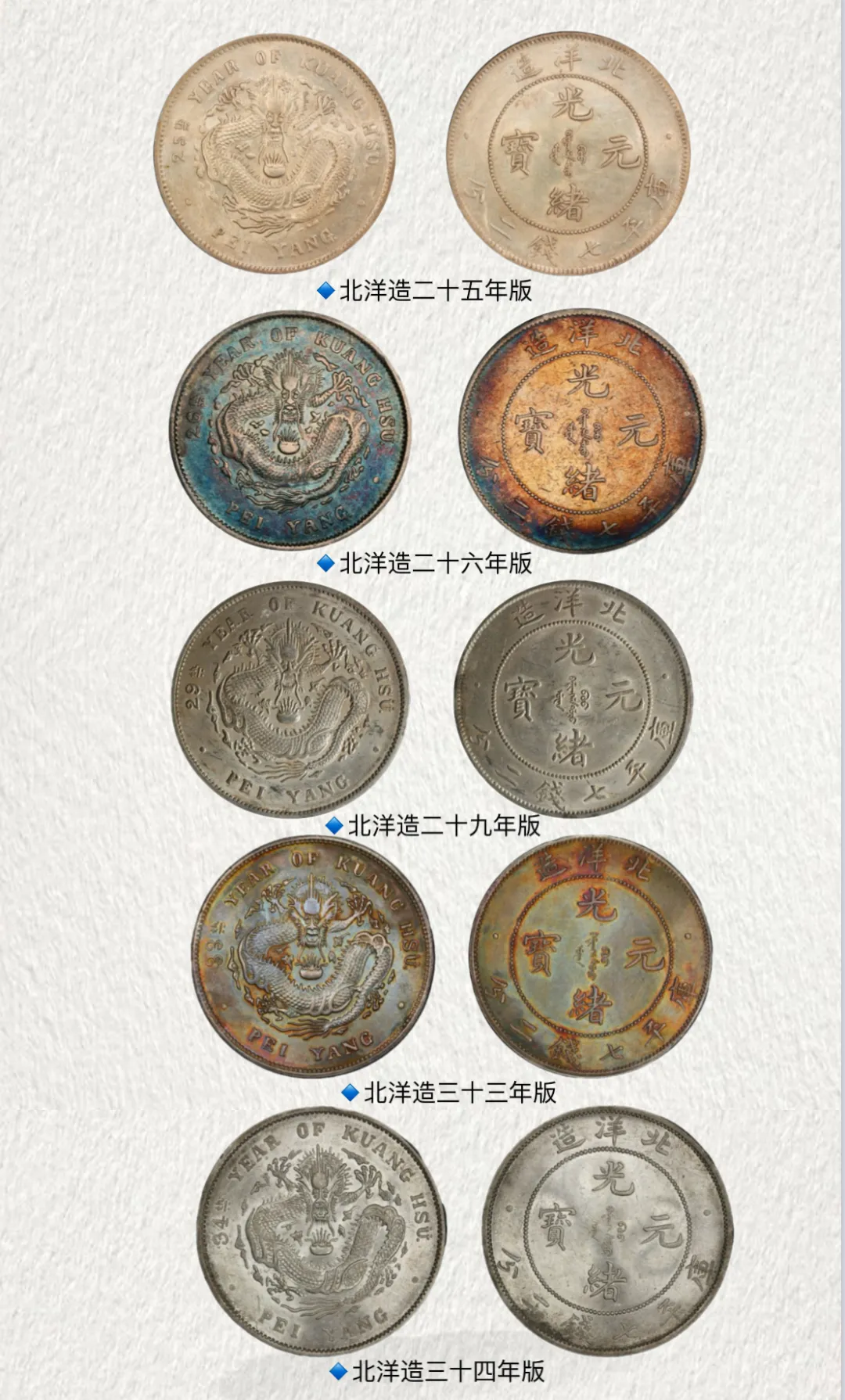 我国银元于清光绪十五年(公元1890)开始正式由官方铸造。民国初期,始以银元作为主要流通货币,进行大量铸造。主要分: