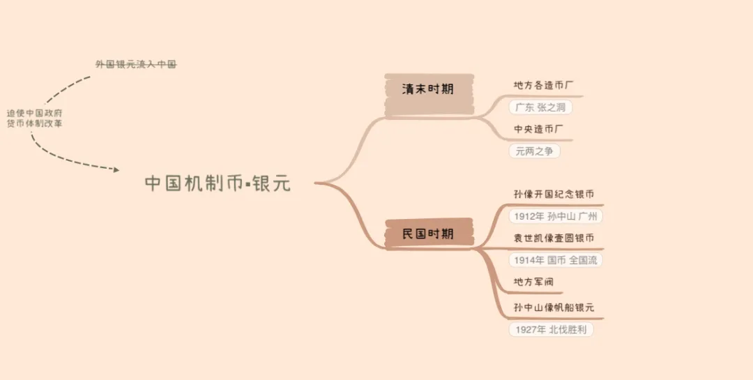 清末铸币:外国银圆流人中国后,因其制作精美及成色、重量的划一,,非常方便,慢慢成为民间交易的工具,银两在流通上的影响力逐渐式微。1838年(清道光十八年)台湾仿洋银形式首创老公银饼。外国银圆的泛滥造成弊端从生、自钢限圆抵制外币之议由初期的受排斥转为逐渐受到重视。两广总督张之洞奏准向英国订购机器下广州大东门外黄华墙勘地建“广东钱局”,此乃中国正式设立专业机器造币厂之始。1890年(清光绪十六年)正式铸造广东龙洋,由于绩效良好,持续运作,各省纷纷跟进,中国自此而始全面以机器造币。同时张之洞也被誉为“中国近代机制币之父”。光绪二十一年(1895年)五月银国局正式开工,湖北成为中国第二个正式设厂生产机制银币的省份。光绪二十五年,清政府下令除广东、湖北两省的银元局之外,其余各省的全部裁撤,但这立即遭到了各省的反对。光绪二十八年又改天津和北洋机器局为北洋铸造银元总局。光绪三十一年又成立铸造银钱总厂,作为户部的造币总厂。光绪三十二年将全国20家银元局、铜元局归并为9家。宣统二年(1910)制定《造币厂章程》、总厂设在天津,另外保留4个分厂,分别设在武昌、成都、云南、广州、后来在奉天(沈阳)又增设一个临时分厂。宣统三年年(1911)辛亥革命爆发,各省纷纷独立,统一铸币机构的工作随即夭折。