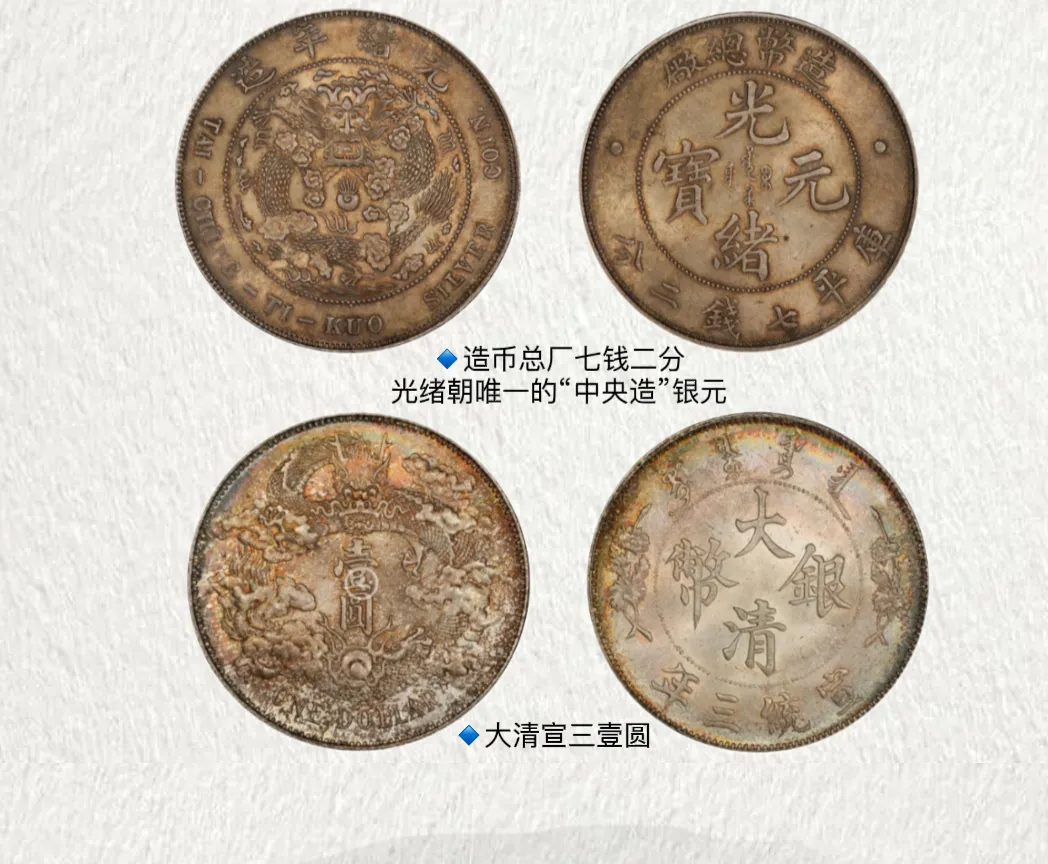 在1887年光绪皇帝采纳张之洞改革币制的建议后,允许广东兴建第一个中国近代造币厂。此后十年间中国的几个省也仿效兴建造币厂,各地所造银币质量较低,使用紊乱。清廷认为应建立中央造币厂,以控制国家币制。因而在1899年6月开始筹建中央造币厂“京局”。1900年,八国联军入侵北京大肆烧抢掠夺,京局造币厂毁于大火。造币厂的工人抢出五种钢模和几个一角、二角的试铸币。这些钢模被转售,有人又利用这些钢模私自铸造几套银币。1903年,清延在天津筹建户部造币总厂,开始铸造银币。先后铸造“户部光绪元宝”、丙午户部“中”字大清银币、丁末大清银币、造币总厂光绪元宝、宣统年造大清银币、宣统三年大清银币等系列。民国十二年和十五年,民国政府铸造了三种龙凤银币。