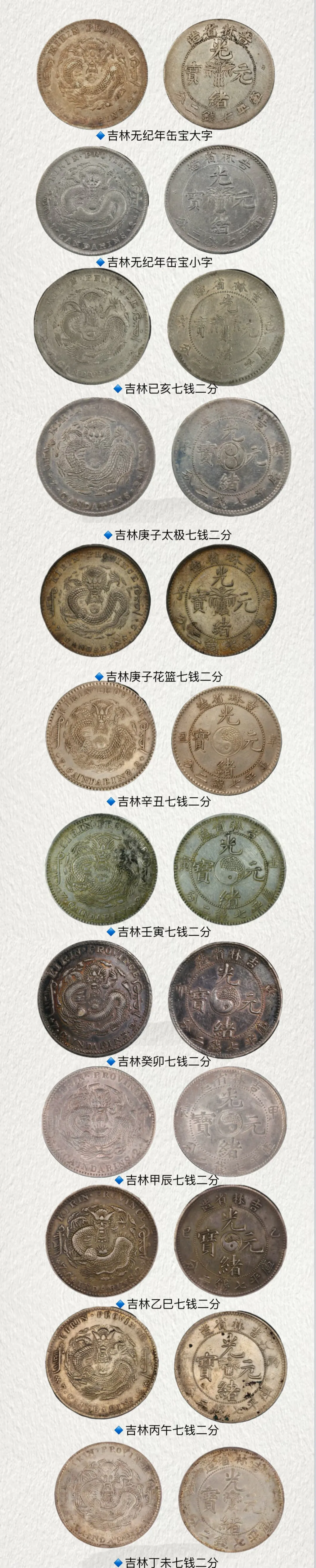 吉林虽然地理位置偏处东北,但它却是我国第一套机制银币“吉林厂平”的铸造地。吉林长期缺乏制钱,市民现钱短缺,造成市场萧条,流通中只能用银票,加上发军饷的需要等原因,光绪十年(1884年)当时的吉林将军希元就向清廷上奏折,要求铸造银元。没待清廷批准,就着手试铸“吉林厂平”银币。结果不久清廷回文不允准,只得停铸,这种银币本来铸量不多,留存下来更是稀少。1897年,吉林机器局试铸一套银元,主币正面中央有一瓶万年青,称为吉林万年青银币。1898年,吉林当局将机器局改为银元局,添置造币机器,铸造大小银元。从1899年起,吉林银币的正面又加铸甲子纪年。1900年,银币面文注“庚子”的除了铸造万年青版别外,还铸造一种阴阳鱼太极图案版别的银币。从1902年至1905年四年吉林省只铸阴阳鱼太极版一种,1906年至1907年只铸万年青版一种。1908年,面文注“戊申”则铸有三种版别,一种是万年青版,一种是满文版,还有一种是数字版。同年,吉林省还铸造一种戊申“吉”字大清银币一两,但很快就停铸了。1910年,吉林省又铸造一种“吉”字宣统元宝库平一钱四分四厘的银币,根据“吉”字阴阳文的不同,可以分两种版别。