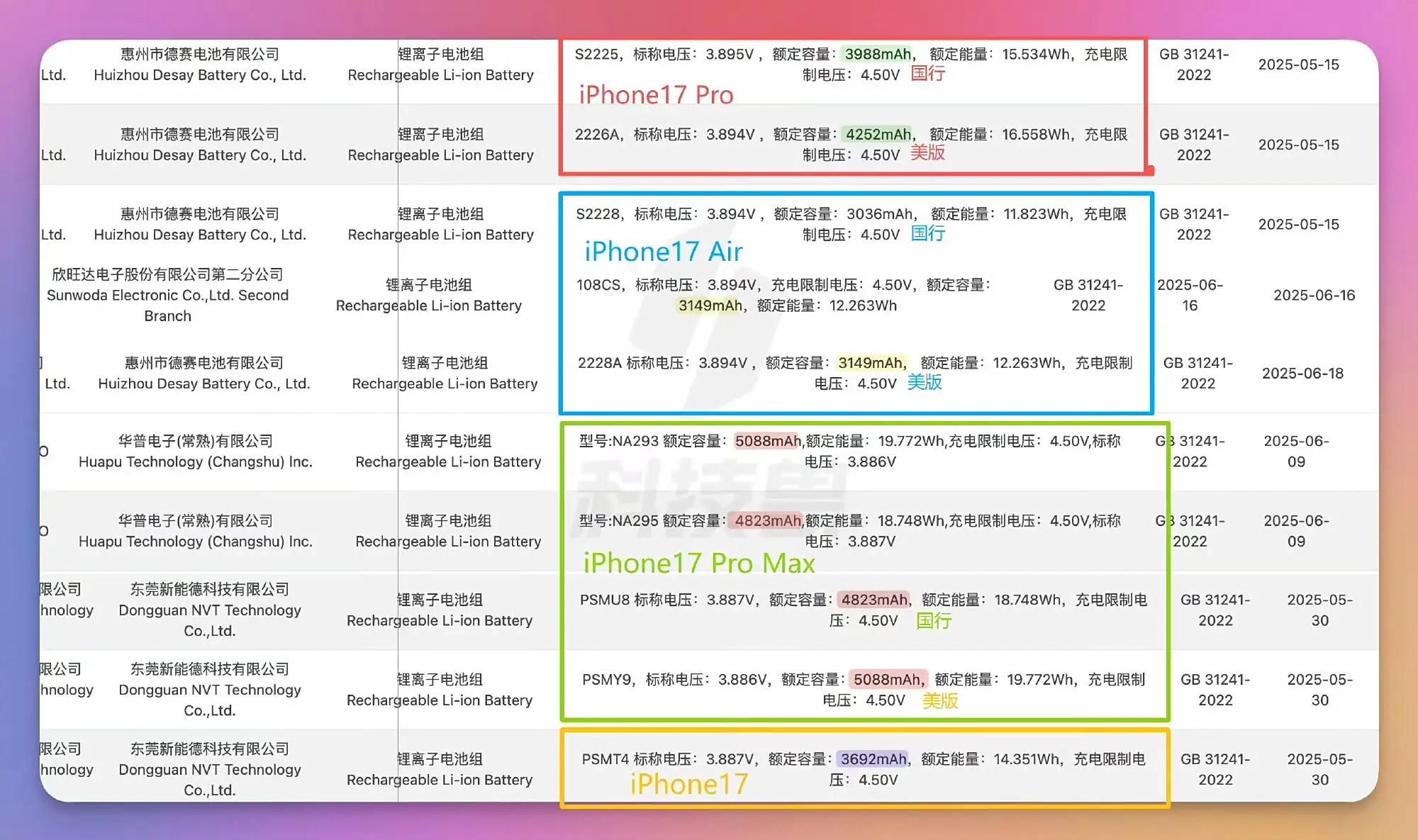 2️⃣ iPhone 17 Pro Max电池首次突破5000mAh,国行略小于美版