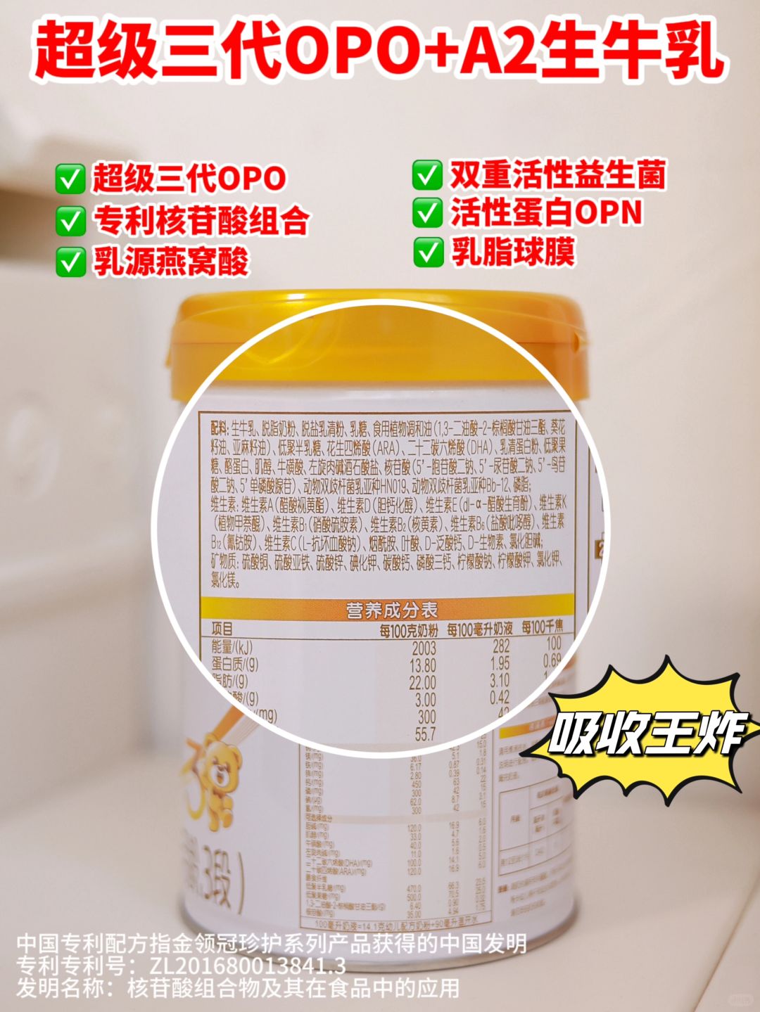 提到好吸收,就不得不提OPO了(可看图4),珍护添加的是【超级三代OPO】,含量高达6.4g/100g,SN-2棕榈酸纯度达到70%的黄金标准。帮助吸收钙、脂肪酸,轻松长肉,再搭配上【双重活性益生菌】【双重益生元】直接把吸收力拉满格,