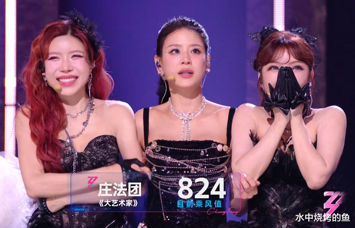 庄法团率先出场,她们带来高难度歌曲《大艺术家》,没有全闭麦对口型,终于开麦了。庄法从天而降,整个舞美和造型让人眼前一亮,整体编排堪称艺术品。