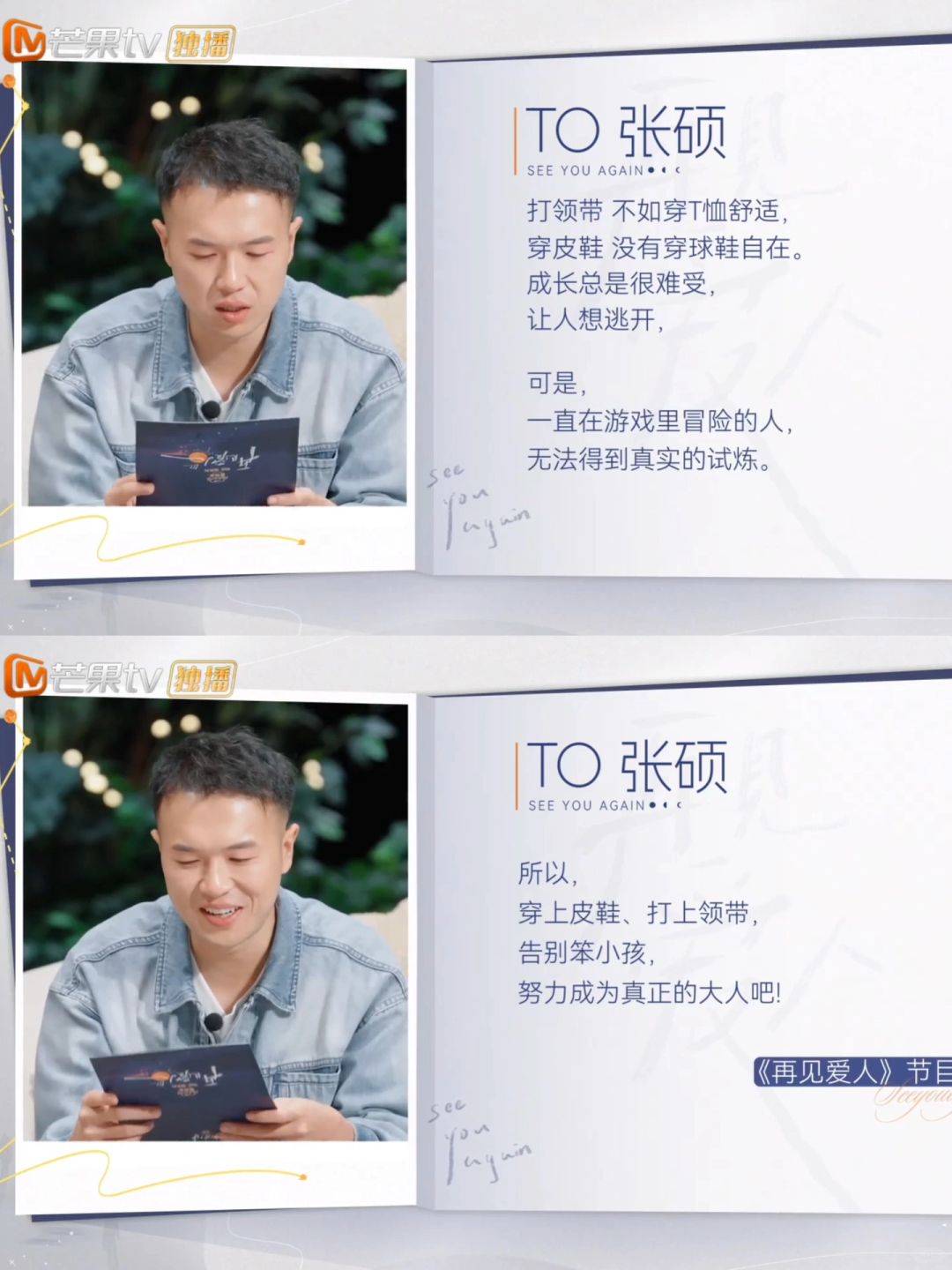 🔥芒果不愧是百万文案,写给嘉宾的祝福太戳心了。你最喜欢哪一段❓ 送给王睡睡:“爱情可以是华美的幻觉,但结节不是。勇敢离开一段不合适的关系,如同狠狠刮过那些被堵塞多年的经脉,痛是必然的。” 送给张硕:“一直在游戏里冒险的人,无法得到真正的试炼” 📺《再见爱人5 番外篇》11.29