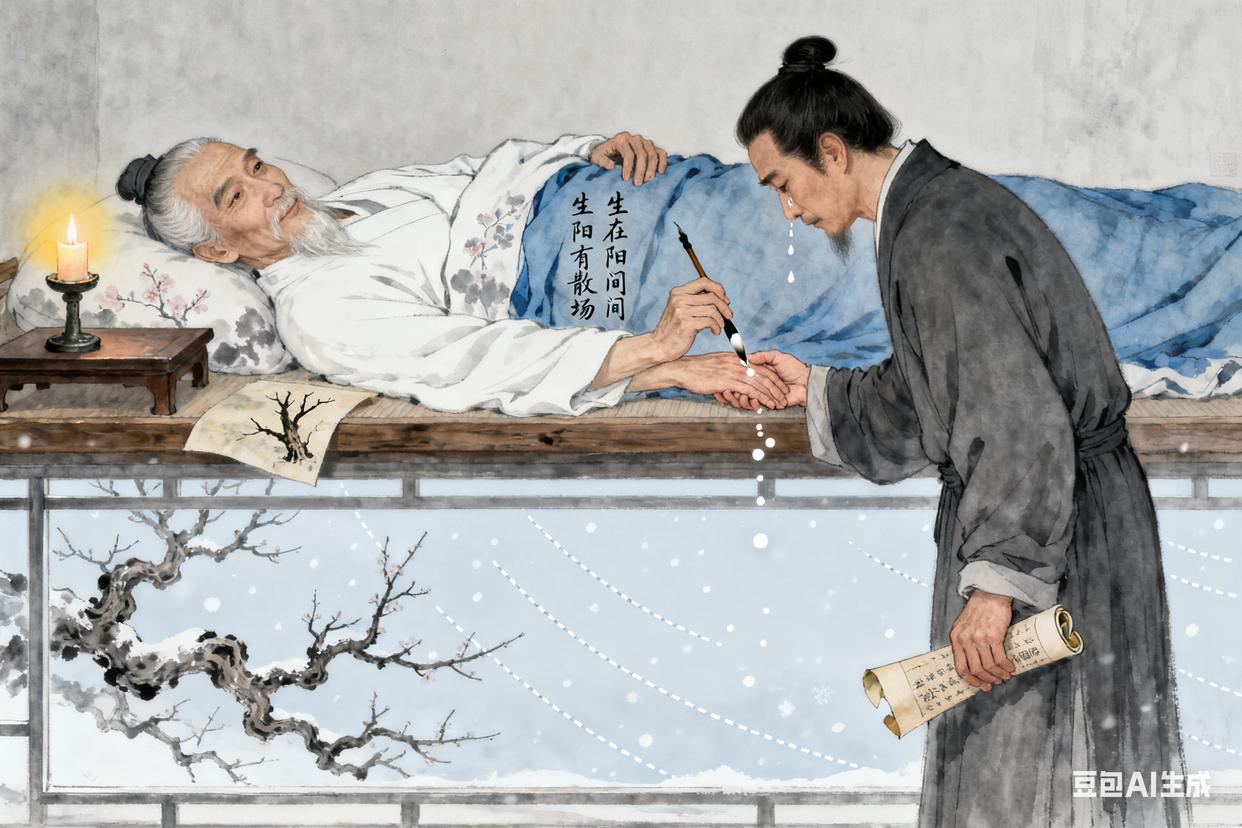 十、临终绝笔,释然归去嘉靖二年(1523年)冬天,唐寅已经病入膏肓。他躺在病床上,看着窗外的枯枝,知道自己快不行了。祝枝山来看他,坐在床边,握着他的手:“伯虎,你还有什么想说的?”唐寅笑了笑,声音很轻:“枝山,我想写首诗。”仆人拿来纸笔,唐寅用尽力气,写下了他的绝笔诗:“生在阳间有散场,死归地府也何妨。阳间地府俱相似,只当漂流在异乡。”写完后,他把笔放下,看着祝枝山:“枝山,我走了以后,桃花庵的桃花,你多照看些。还有,我的画,要是有人喜欢,就送给他们,不要卖钱。”祝枝山点了点头,眼泪掉了下来:“你放心,我会的。”唐寅又看了一眼窗外,好像看到了春天的桃花,看到了年轻时的自己,看到了父母、妻子……他笑了,然后慢慢地闭上了眼睛。那一年,他五十三岁。