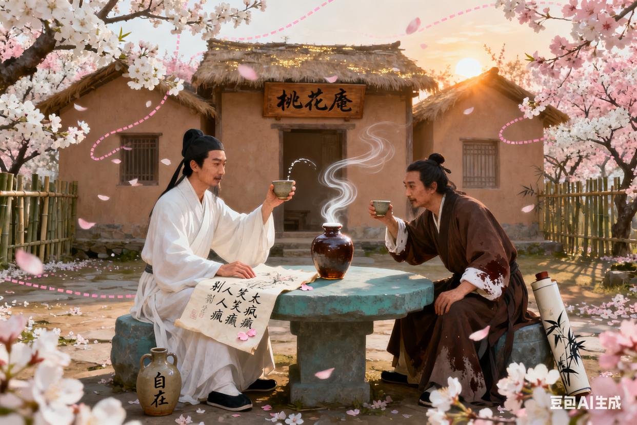 七、桃花庵里,自在为仙弘治十八年(1505年),唐寅回到苏州,用这些年卖画攒的钱,在桃花坞买了一块地,建了几间茅屋。他给茅屋取名“桃花庵”,还在院里种了几十棵桃树。建房的时候,工匠觉得他一个才子怎么这么穷,连像样的木料都买不起。唐寅却不在意,他亲自设计房子,每天去工地看进度,有时候还帮工匠递钉子、搬木板。他说:“房子不用华丽,能遮风挡雨就行,关键是住得自在。”春天来了,桃花开了,满院都是粉白的花,风吹过,花瓣落在地上,像铺了一层地毯。唐寅坐在院里的石桌旁,喝着酒,看着桃花,觉得终于有了一个属于自己的地方。他在诗里写:“桃花坞里桃花庵,桃花庵里桃花仙。桃花仙人种桃树,又摘桃花换酒钱。”没有了科举的束缚,没有了别人的眼光,他终于活成了自己想要的样子——一个“桃花仙人”。有一次,祝枝山来拜访,看到院里的桃花,笑着说:“伯虎,你这日子,比神仙还自在。”唐寅递给他一杯酒:“神仙有什么好?他们不能喝酒,不能画画,哪有我自在?”两人喝着酒,聊着天,直到夕阳西下。祝枝山走的时候,唐寅送了他一幅《桃花图》,题诗:“别人笑我太疯癫,我笑他人看不穿。不见五陵豪杰墓,无花无酒锄作田。”那是他的心声——世俗的富贵荣华,不过是过眼云烟,只有自在的生活,才是真正的幸福。
