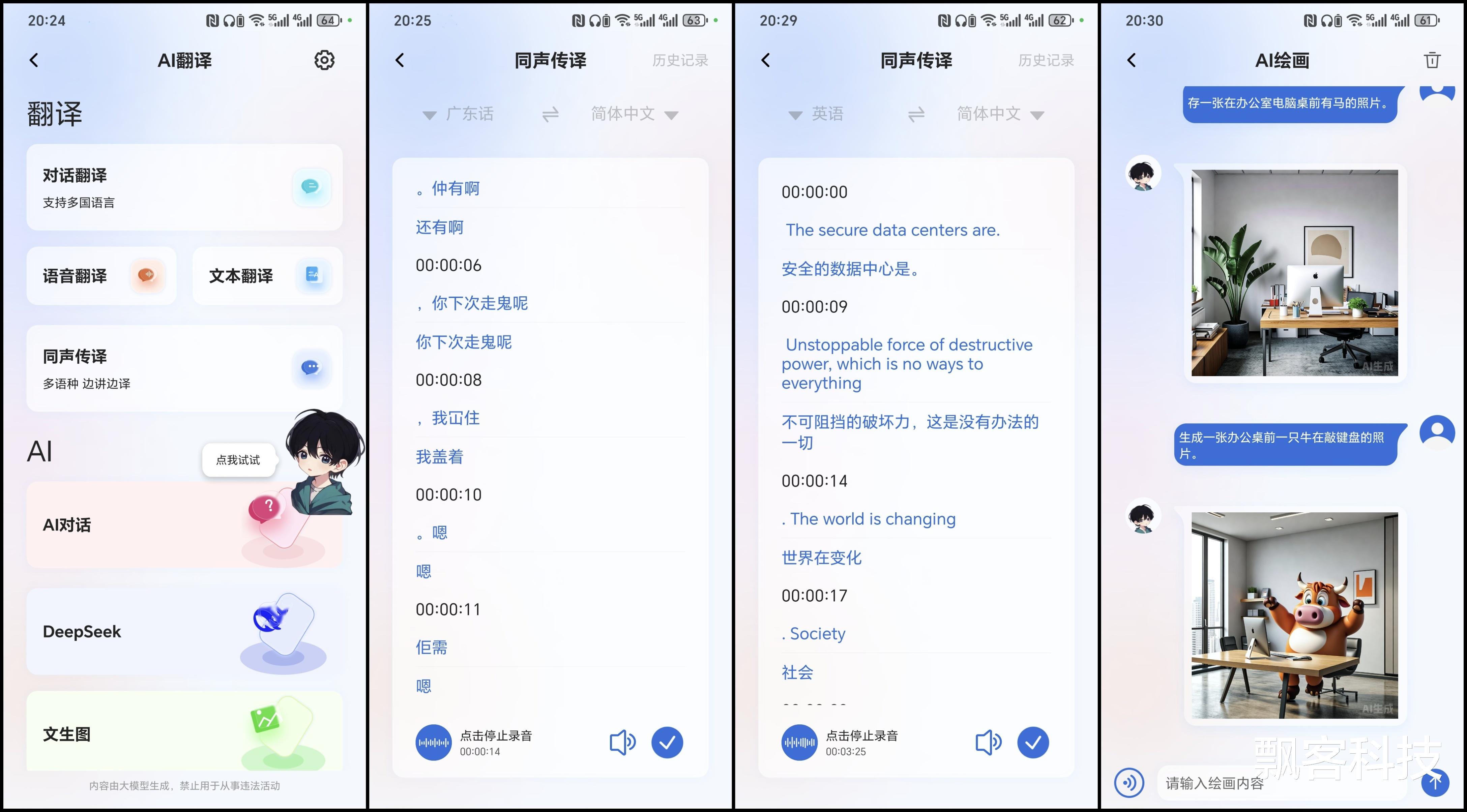 通过实际测试,这些智能功能确实挺好用的,比如同声传译如同随身翻译,即时的将地方方言或英语翻译出来,而且还能通过文字描述AI绘图,整体来说和描述的一致。