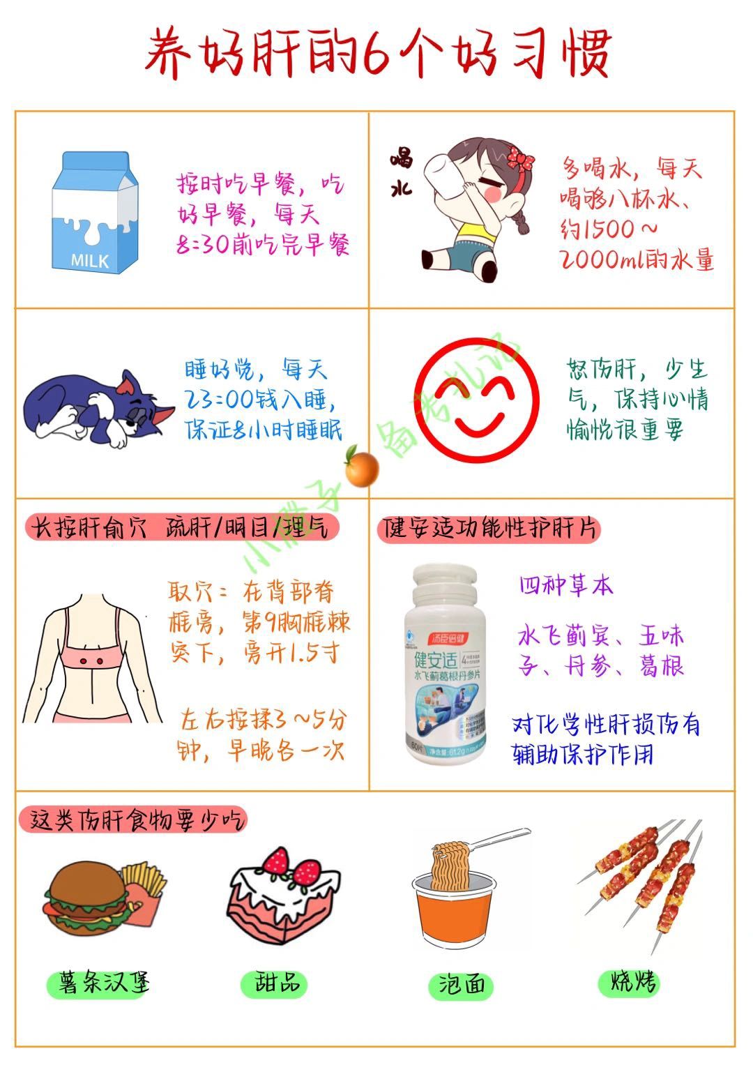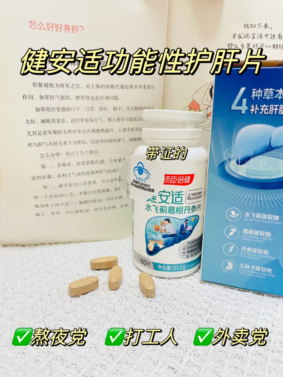 🌞肝,五脏之一,是人体最大,功能最多的器官,也是维持生命活动的重要器官。正常的肝脏位于人体右季肋区及腹部上去,成红褐色,形似楔形。大部分肝脏被肋弓所覆盖,露出部分仅局限于腹部上区、右肋弓间,而且直接与腹部前壁触碰,肝脏的上面还与膈及腹部前壁相连。 🌞在维持生命活动的过程中,肝也具有十分重要的意义。肝不仅能帮助营养代谢,为机体提供能量,还起着解D、促进脂肪消耗、制造血液等功能。打工人养颜先养肝,肝好人不老‼️ 如何自测肝脏的健康❓ 头发:爱出油、老掉发、出现白发 牙齿:刷牙频繁出血 嘴巴:口干、口苦、口臭 眼睛:眼睛干涩/红肿、视物模糊 指甲:指甲有竖纹 ..................................................... 熬夜打工人自救指南,养颜先养肝‼️这份养护指南请查收✅ 1⃣️日常养护饮食指南:多吃青色食物、酸味食物、补肝血食物; 2⃣️养好肝的6个好习惯 🍀按时吃早餐,每天8:30之前吃完早餐 🍀多喝水,每天保持八杯水 🍀睡好觉,每天11:00之前入睡,保证好睡眠 🍀怒伤肝,保持预约好心情 🍀常按肝俞穴:疏肝/明目/理气 🍀健安适功能性护肝片:带证的,同时四大草本精华提取物(水飞蓟宾+五味子+丹参+葛根),都是传承前年的护肝精华,把护肝安排的明明白白的。水飞蓟宾是227倍精粹提取出来的护肝成分,高活性+高含量!是护肝的一把好手啦。每天早晚1次,1次2片,坚持服用,呵护肝脏~ 🍀伤肝的饮食要少吃:薯条🍟汉堡🍔、甜品🍮、泡面、腌制品等 所以,姐妹们,想要支棱起来,get它[赞R] *保健食品不是药物,本品不能代替药物 *适宜人群:有化学性肝损伤危险者 *不适宜人群:少年儿童、孕妇、乳母 *广审批文号:粤食健广审(文)第240724-06529