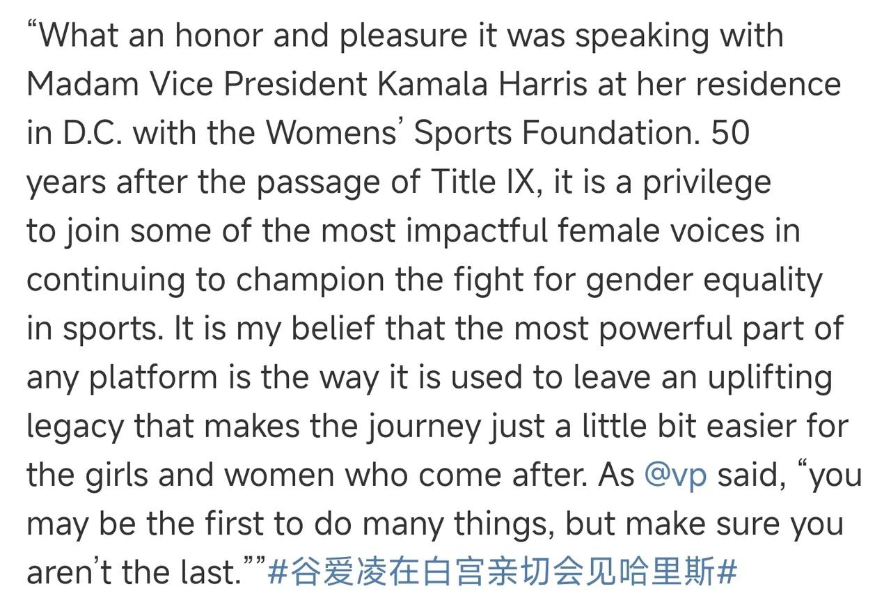 谷爱凌今天来到美国🇺🇸白宫,和美国副总统哈里斯会面,另外谷爱凌还晒出自己和80岁的网坛名宿比莉·简·金一起合影。 此次活动,旨在推动性别平等。 谷爱凌写道:“很荣幸和高兴在副总统卡马拉·哈里斯女士在华盛顿特区的住所与妇女体育基金会进行交谈。在第九条通过50年后,我很荣幸能加入一些最有影响力的女性声音,继续为体育领域的性别平等而斗争。我相信,任何平台最强大的部分都是它用来留下令人振奋的遗产的方式,使后来的女孩和妇女的旅程变得更容易一点。就像副总统您说的,“你可能是第一个做很多事情的人,但要确保你不是最后一个。” #记录我的2024#