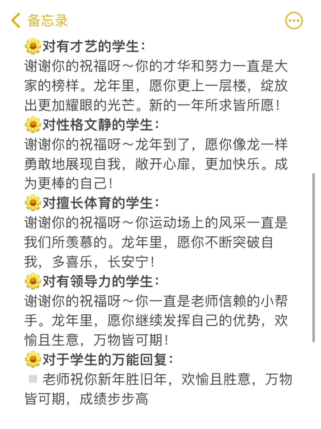 谢谢你的祝福呀~你的才华和努力一直是大家的榜样。龙年里,愿你更上一层楼,绽放出更加耀眼的光芒。新的一年所求皆所愿!🌼对性格文静的学生: