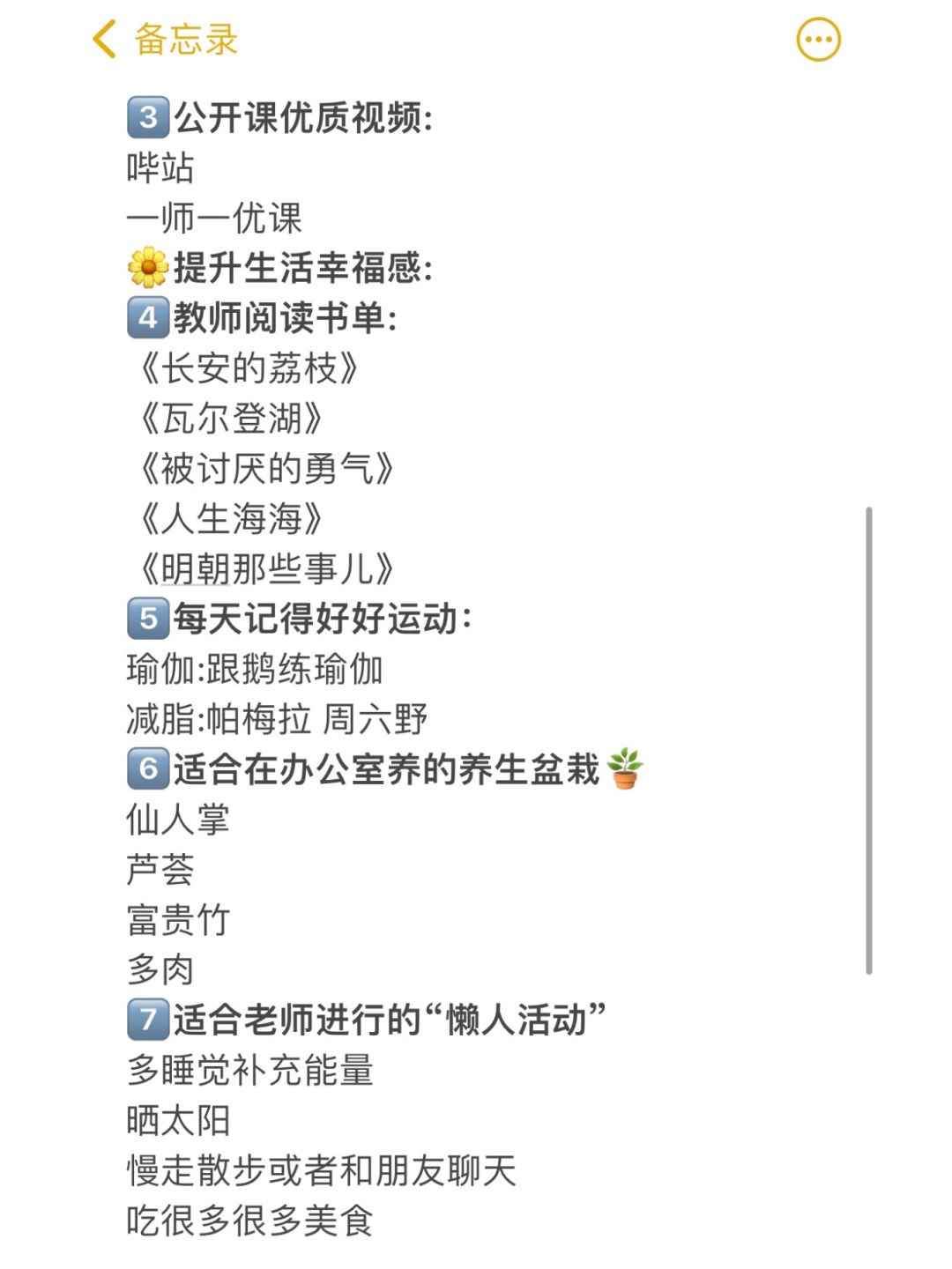总结了一些年轻教师入职一定会用到的实用工具,少走弯路,从职场到生活,每一个都是自己在用的,尊嘟很实用,幸福感爆棚! 🌼教学备课方面 1️⃣课件教案、ppt: 七彩课堂 学科网 希沃白板 2️⃣教师减负神器: 🌟易查分(学生成绩) 双➖规定不可以轻易透露学生的成绩,许多家长想知道成绩,不能把成绩公布出来。单发费时费力,我一直在用易查分官微小🍊序,🔍:易查分官微,导入成绩单,再将查分码发给家长,家长们就可以通过姓名或学号查询成绩,每个家长只能看到自己小孩的成绩,很方便。保护学生的隐私,特别是临近期末,用它就能给老师省太多事,主要的一点是它完全🆓噢!! ▫️平时还可以用它制作活动报名、表单收集系统,自动分配报名号、座位号等等 3️⃣公开课优质视频: 哔站 一师一优课 🌼提升生活幸福感: 4️⃣教师阅读书单: 《长安的荔枝》 《瓦尔登湖》 《被讨厌的勇气》 《人生海海》 《明朝那些事儿》 5️⃣每天记得好好运动: 瑜伽:跟鹅练瑜伽 减脂:帕梅拉 周六野 6️⃣适合在办公室养的养生盆栽🪴 仙人掌 芦荟 富贵竹 多肉 7️⃣适合老师进行的“懒人活动” 多睡觉补充能量 晒太阳 慢走散步或者和朋友聊天 吃很多很多美食