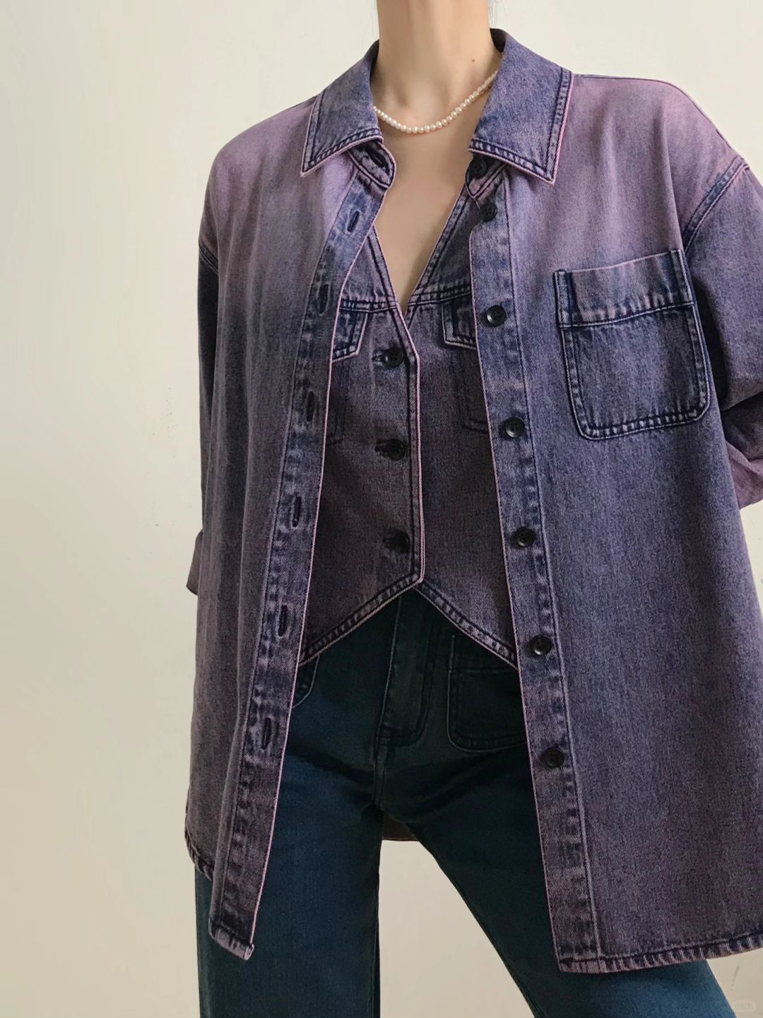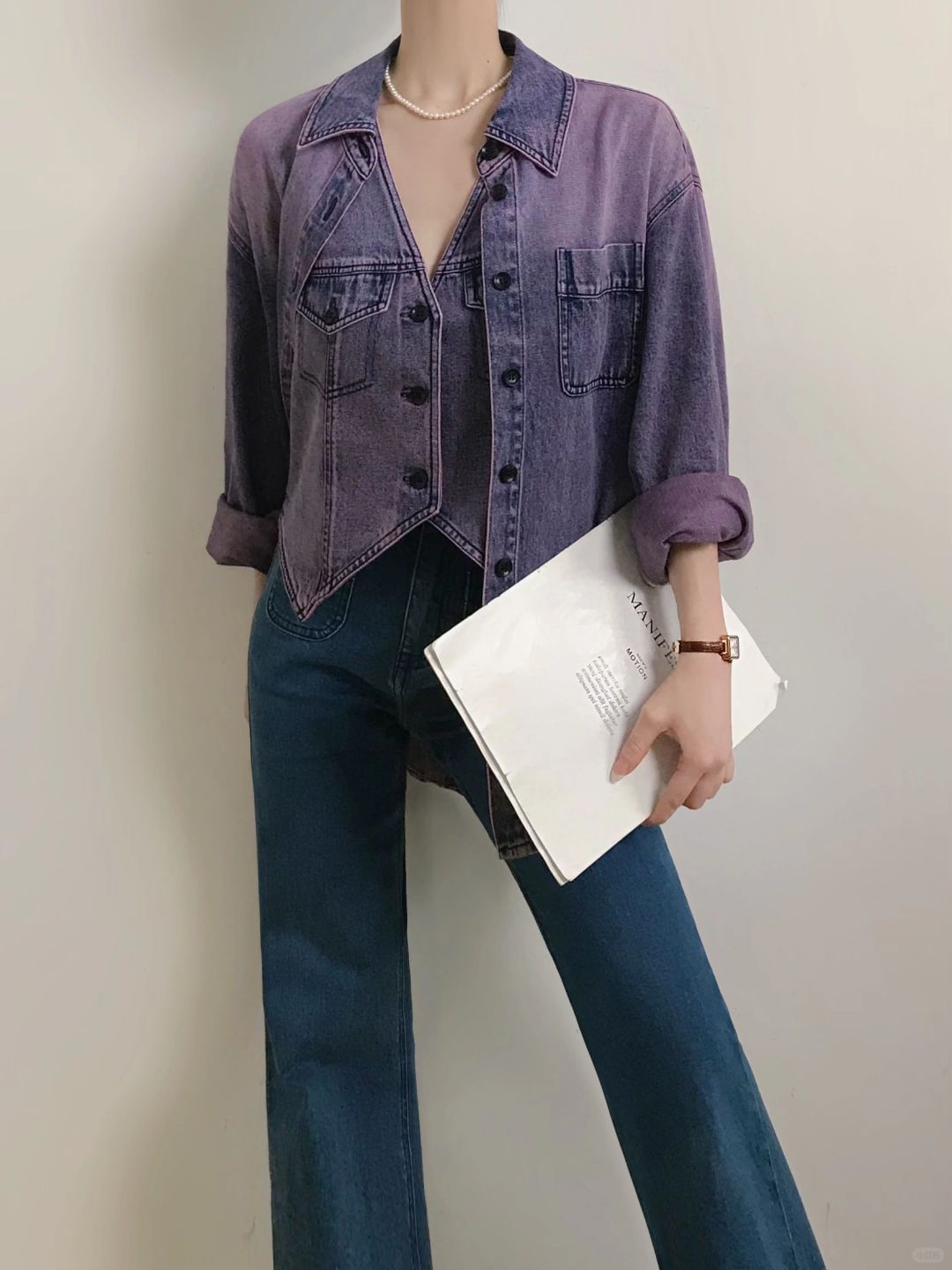 春天就应该试试充满生机的色彩 好好看的一个复古紫色!! 紫色牛仔衬衫➕马甲 搭一条微喇牛仔裤 简单就很耐看气质