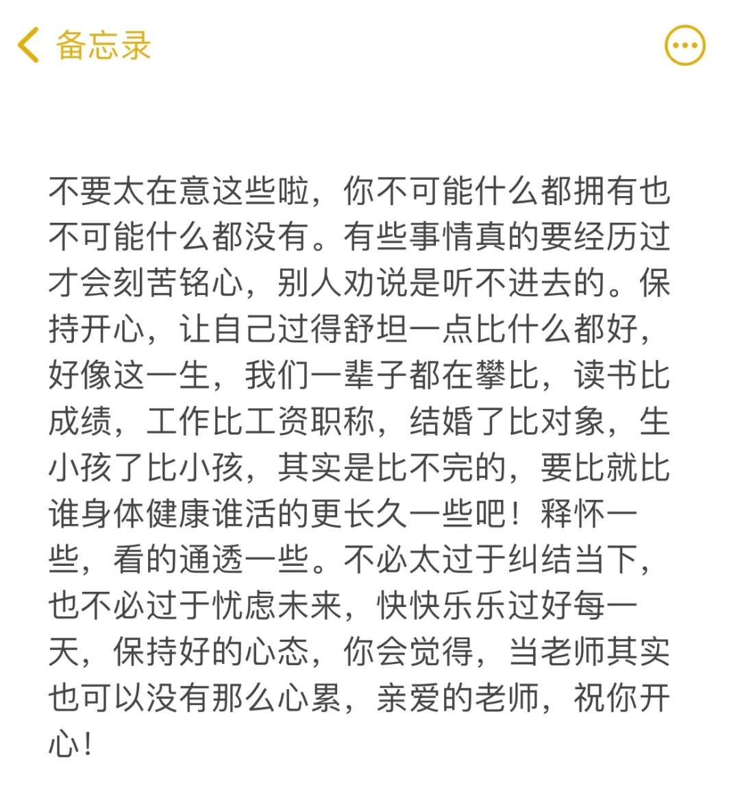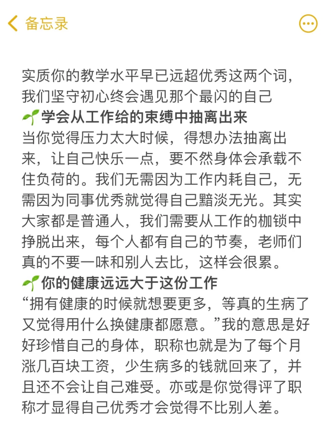 🌱亲爱的老师,不优秀一点儿也没关系! 其实真的不用过于追求优秀和完美。很多事情只要做到合格就行啦,不要过于质疑自己的教学水平。卷不动,躺不平,身体健康最重要。你不可能什么都拥有,你也不可能什么都没有。不内耗自己,不谈情怀,只谈工作。可爱漂亮老师不该有那么多烦恼。快乐才是生活的主旋律!请你保持开心! 🌱你的能力实际早已超过 “优秀”两字 不用因为工作中各种评比,学生的成绩,就不断质疑自己的教学水平。你要知道有时候能力没有你好的人,但是比你更懂人情世故,反而很快就能得到职称,难道你就因为这个就怀疑自己的能力了吗?你也要知道,学生的生源也会决定你带的班级排第一或者倒一。这些真的证明不了你的能力,反而作为老师需要有自我治愈的能力,很多时候不是靠那两个词来支撑教学,实质你的教学水平早已远超优秀这两个字。 🌱学会从工作给的束缚中抽离出来 当你觉得压力太大时候,得想办法抽离出来,让自己快乐一点,要不然身体会承载不住负荷的。我们无需因为工作内耗自己,无需因为同事优秀就觉得自己黯淡无光。其实大家都是普通人,只是有人走得快,有人慢。我们需要从工作的枷锁中挣脱出来,每个人都有自己的节奏,老师们真的不要一味和别人去比,这样会很累。 🌱你的健康远远大于这份工作 “拥有健康的时候就想要更多,等真的生病了又觉得用什么换健康都愿意。”我的意思是好好珍惜自己的身体,职称也就是为了每个月多涨几百米,少生病多的米就回来了,并且还不会让自己难受。亦或是你觉得评了职称才显得自己优秀才会觉得不比别人差。不要太在意这些啦,你不可能什么都拥有也不可能什么都没有。有些事情真的要经历过才会刻苦铭心,别人劝说是听不进去的。保持开心,让自己过得舒坦一点比什么都好,好像这一生,我们一辈子都在攀比,读书比成绩,工作比工资职称,结婚了比对象,生小孩了比小孩,其实是比不完的,要比就比谁身体健康谁活的更长久一些吧! 🌸释怀一些,看的通透一些。不必太过于纠结当下,也不必过于忧虑未来,快快乐乐过好每一天,保持好的心态,你会觉得,当老师其实也可以没有那么心累,亲爱的老师,叮叮祝你天天开心!