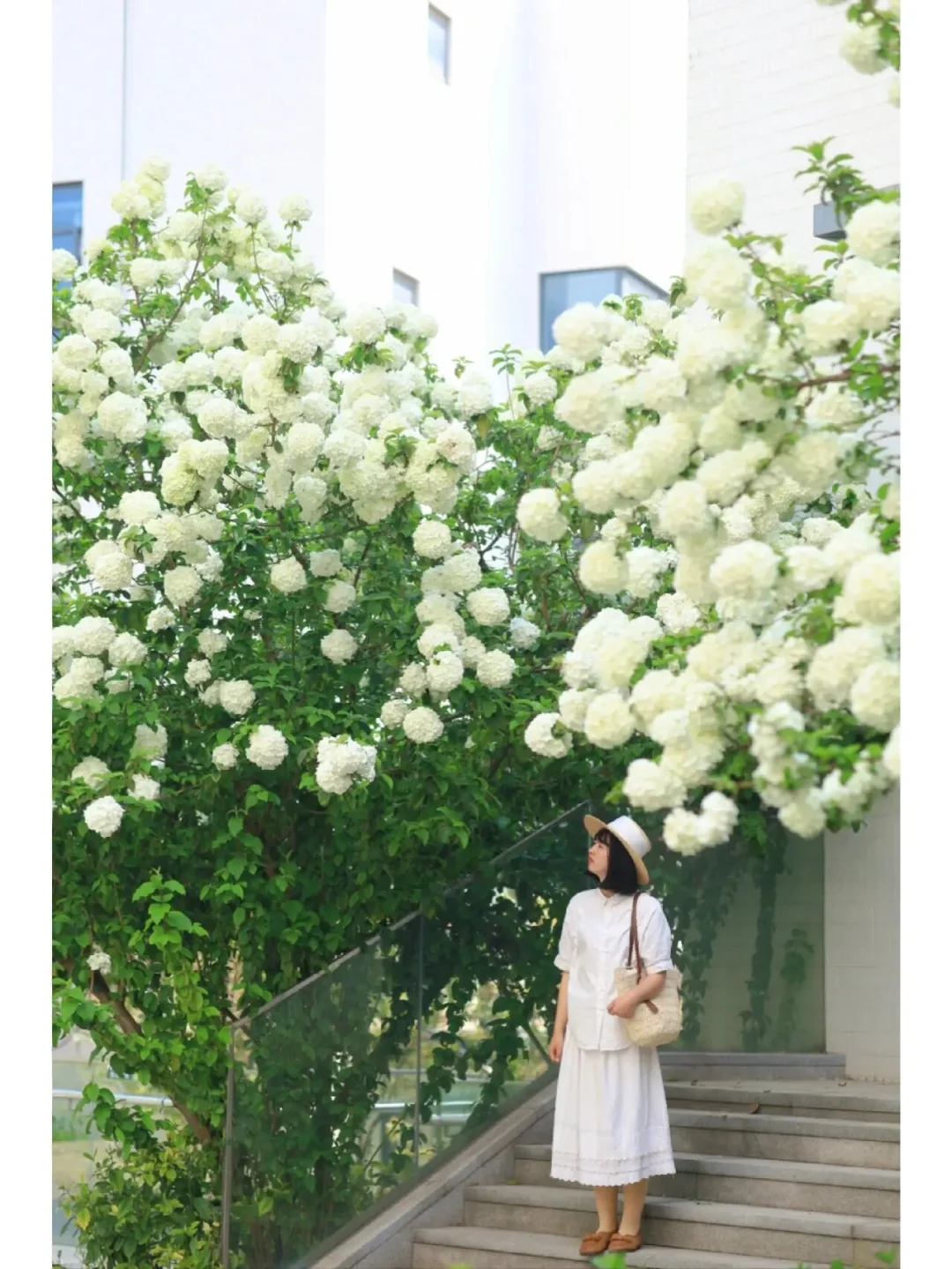 有四五颗开的很好很密集,还有楼梯和白色建筑适合拍人像