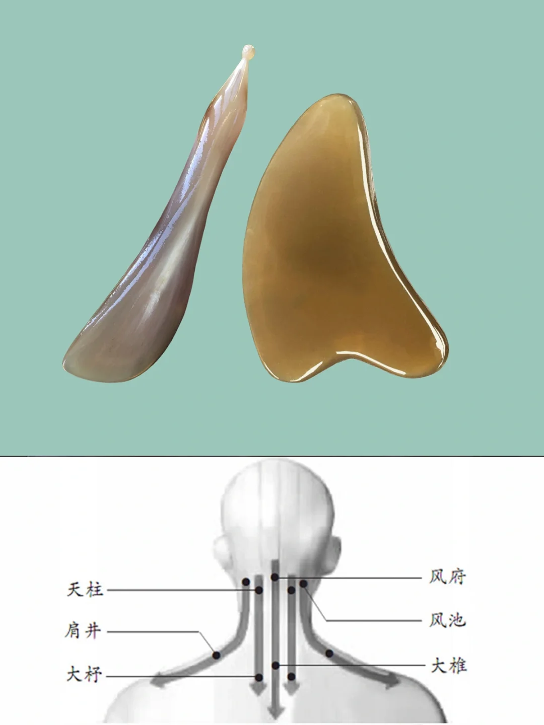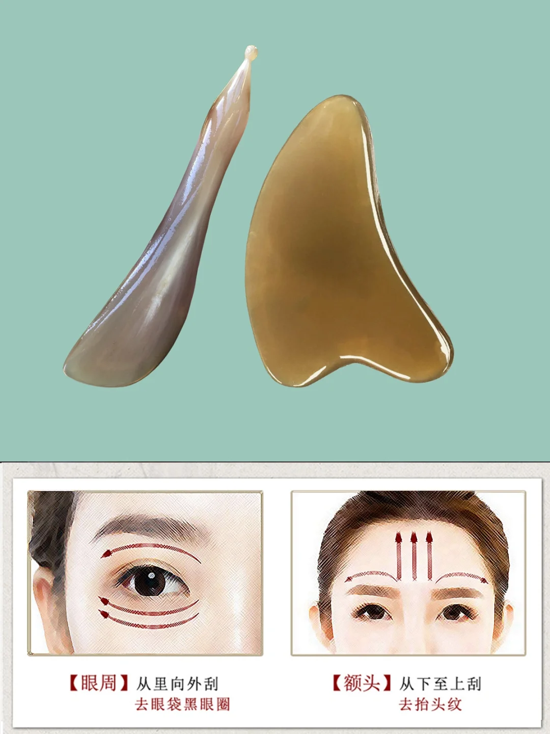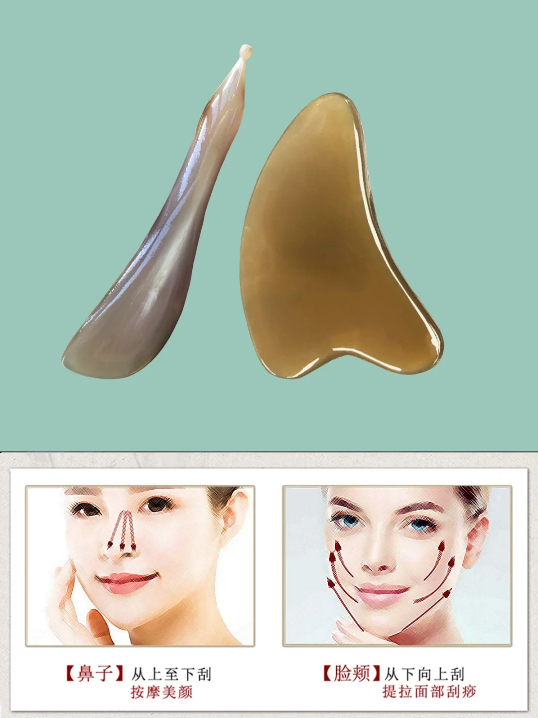 🌸1、卸彩妆 产品:卸妆油 🌸2、洁面 产品:洗面奶 深层洁面会用到酵素粉或者去角质啫喱等(选择其中一个产品) 🌸3、化妆水整理肌肤 🌸4、均匀涂抹润滑油 🌸5、按手法、顺序做面部刮痧 🌸6、清洁面部多余油 🌸7、化妆水整理面部肌肤 🌸8、涂抹营养精华、敷面膜,促进营养吸收 🌸9、如果需要出门,再过一遍水、乳、霜、眼霜、防晒霜等; - 🔴手法顺序及方向: ~~~额头~~~ 眉毛位置——发际线 ~~~鼻部~~~ 印堂——鼻尖 ~~~眼周~~~ 上下眼眶,由里往外 ~~~面颊~~~ 鼻翼——太阳穴 鼻翼——耳前 法令纹——耳前 ~~~下颌线~~~ 下巴——耳前 ~~~脖子~~~ 耳后——脖子往下 - 工具 牛角刮痧板:厚0.7-1.0左右 牛角拨筋棒:长10-13cm左右 对应护肤品 - 中福康牛角刮痧板,拨筋棒,梳子 天然产品,任何2个都不会一样