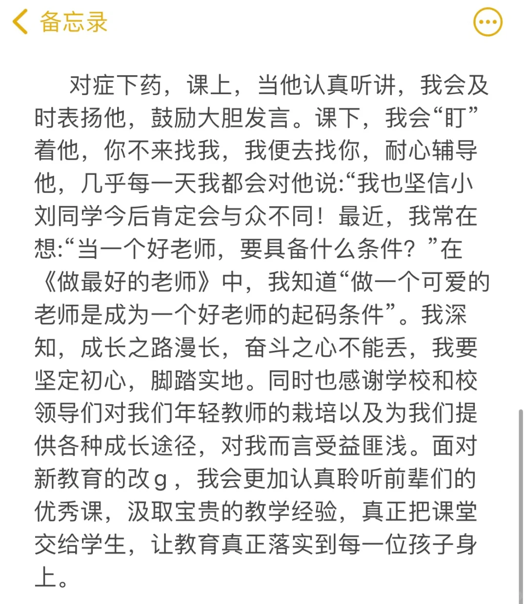 没有爱,就没有教育。也许工作时常让人感觉到疲惫,但是我们要坚信,或许,有一个孩子因为我们而改变了,那我们的教育就是成功的。 师者,传道授业解惑也。教学工作使我深刻感悟到:学生工作需用心,需有爱!爱是一种伟大而神奇的力量!老师对学生的爱更将会让这些花开放得绚丽多彩。教育路虽短,但在孩子的身上发现了以前的自己——想要展现自己,却又害怕在大众面前亮相,我深知那是缺乏信心,缺少来自老师们的关爱。 《爱的教育》中有这种一段话:“教育没有情感,没有爱,如同池塘没有水一样。没有水,就不成池塘,没有爱就没有教育”。小刘同学就是这样一个内向腼腆的学生。课上,他听讲认真,不开小差,可布置下去的作业一改不是空就是错。问个缘由,半天不吭声。耐心教导鼓励才懂得他听不懂,却又害怕找人询问。 课上,当他认真听讲,我会及时表扬他,鼓励大胆发言。课下,我会“盯”着他,你不来找我,我便去找你,耐心辅导他,几乎每一天我都会对他说:“我也坚信小刘同学今后肯定会与众不同!最近,我常在想:“当一个好老师,要具备什么条件?” 在《做最好的老师》中,我知道“做一个可爱的老师是成为一个好老师的起码条件”。我深知,成长之路漫长,奋斗之心不能丢,我要坚定初心,脚踏实地。同时也感谢学校和校领导们对我们年轻教师的栽培以及为我们提供各种成长途径,对我而言受益匪浅。面对新教育的改g ,我会更加认真聆听前辈们的优秀课,汲取宝贵的教学经验,真正把课堂交给学生,让教育真正落实到每一位孩子身上。