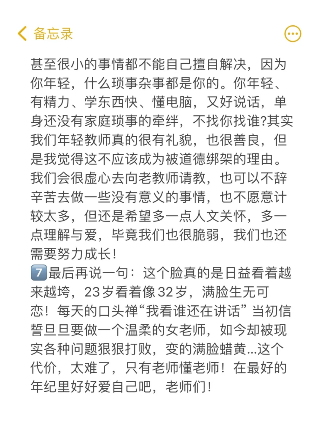 大部分年轻教师真的很有礼貌,也很善良,但是我觉得这不应该成为被道德绑架的理由。我们会很虚心去向老教师请教,也可以不辞辛苦去做一些没有意义的事情,也不愿意计较太多,但还是希望多一点人文关怀,多一点理解与支持,毕竟我们也很脆弱,我们也还需要努力成长! 当然也遇到过很好的老教师,以上指的是部分不礼貌的人哦,每个在我们入职初期带给我们光与爱的老师,我们都会铭记在心~