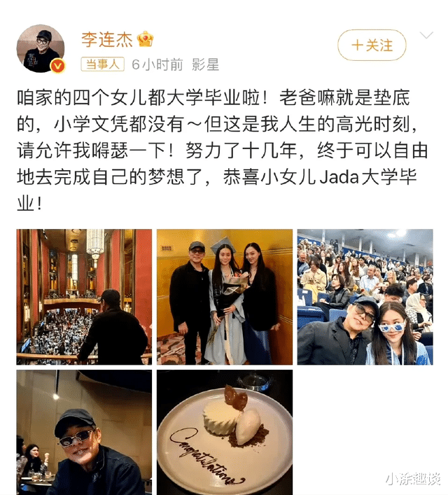 晒照发文,老父亲的“得瑟”时刻瞧瞧李连杰晒出的照片,画面中,他和小女儿开心合影,那脸上的笑容啊,都快溢出屏幕了。Jada穿着学士服,青春靓丽,气质出众,眉眼间还真有几分李连杰的影子。旁边还摆放着庆祝毕业的蛋糕,温馨又甜蜜。李连杰在文中透露,四个女儿都已经大学毕业,还调皮地说“请允许我得瑟一下”。嘿,这“得瑟”里,可全是满满的自豪和骄傲啊!