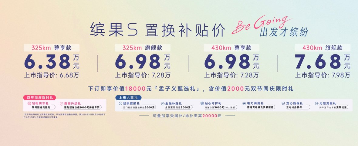 从孟子义代言的潮流破圈,到鎏光美学的颜值表达;从“大平层”空间的实用主义,到灵语AI的智能革新;从双续航的出行自由,到欧标级的安全兜底,缤果S以6.38万起的亲民价格,将高质感出行体验拉至新底线。在新能源汽车市场竞争白热化的当下,这款车型精准切中年轻用户对颜值、空间、智能、安全的多重需求,不仅为缤果家族注入新活力,更有望重塑7万级纯电市场的竞争格局。