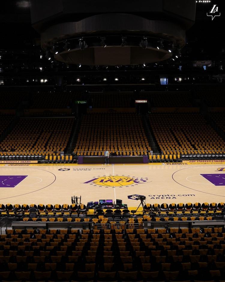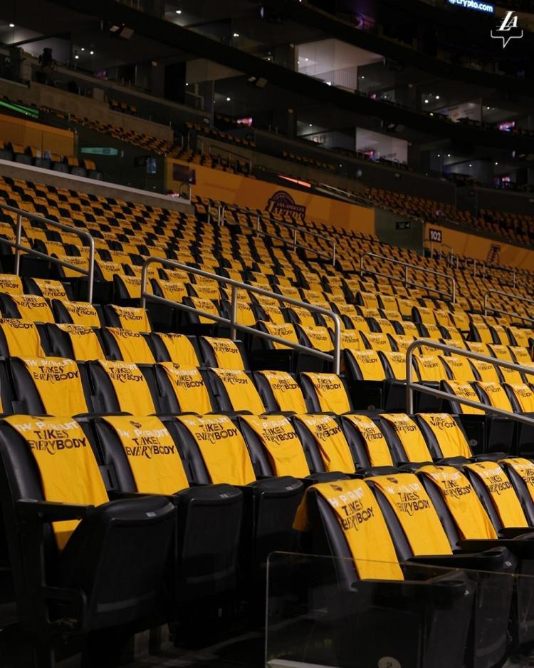 湖人官方晒出球队主场氛围,球馆每个座位上都配有金黄色T恤,上面标有湖人今年季后赛口号“TAKES EVERYBODY(紫金一心)”。