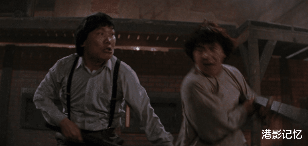 另外一场戏,他要用身体接住向下翻落的成龙,完全凭臂力和腰力撑住成龙才完成这惊险一幕。