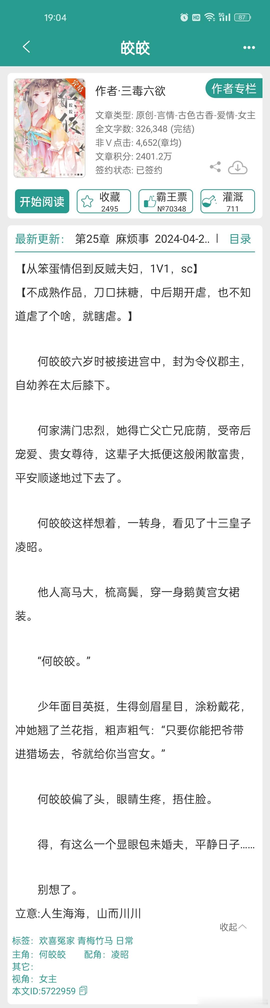 没仔细看简介,一开始甜得齁人,后面就开始各种虐[允悲][允悲]如简介所言,虐得乱七八糟的,男女主过于傻白甜(会成长)男主家人过于搞事情[笑cry][笑cry]。