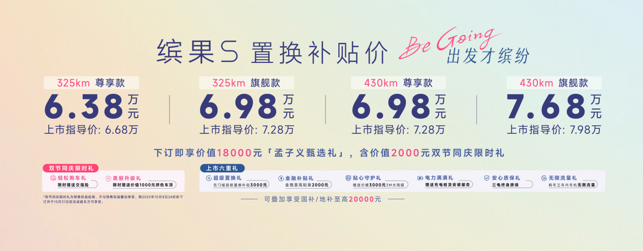 缤果S共推出四款配置,上市指导价为6.68万-7.98万元,叠加置换政策可享置换补贴价6.38万-7.68万元,更可叠加享受至高20,000元的国家/地方购车补贴。
