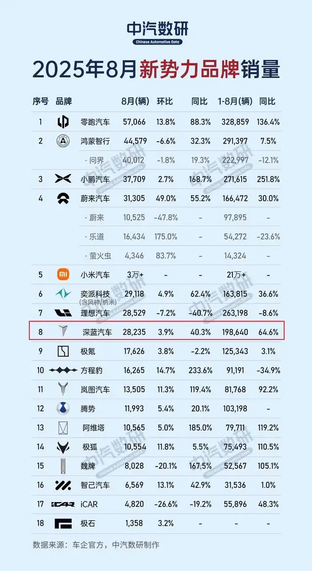 根据中汽数研统计,今年1-8月,零跑汽车累计销量32.89万辆,位居新势力品牌第一,同比增长达136.4%;鸿蒙智行累计销量29.14万辆,位居第二;小鹏汽车累计销量27.16万辆,位居第三,同比增幅高达251.8%。