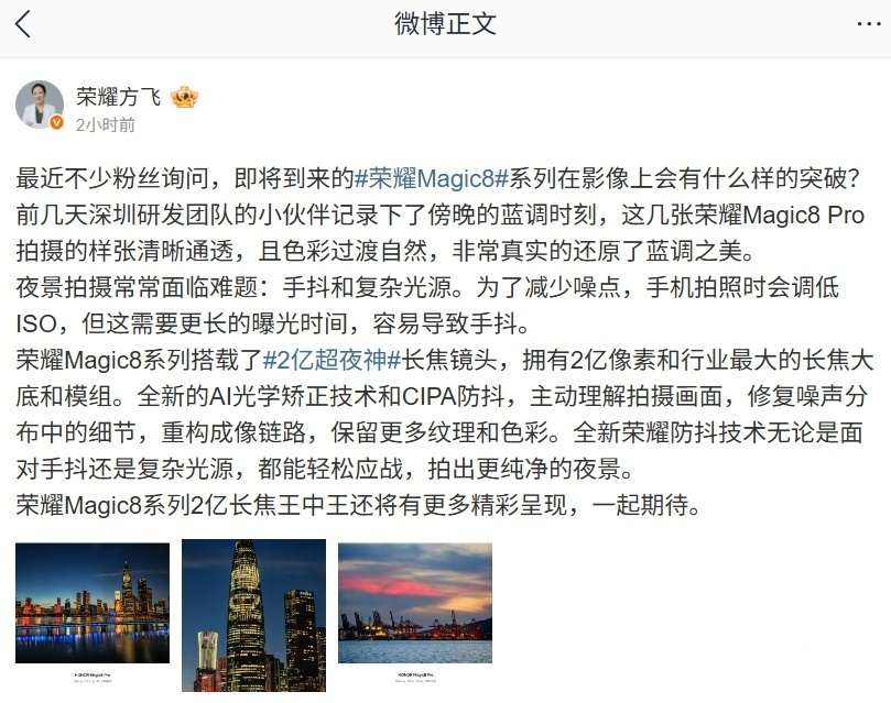 日前,@荣耀方飞 发布了三张荣耀Magic8 Pro的暗光和夜景样张,并发长文称,“最近不少粉丝询问,即将到来的#荣耀Magic8#系列在影像上会有什么样的突破?