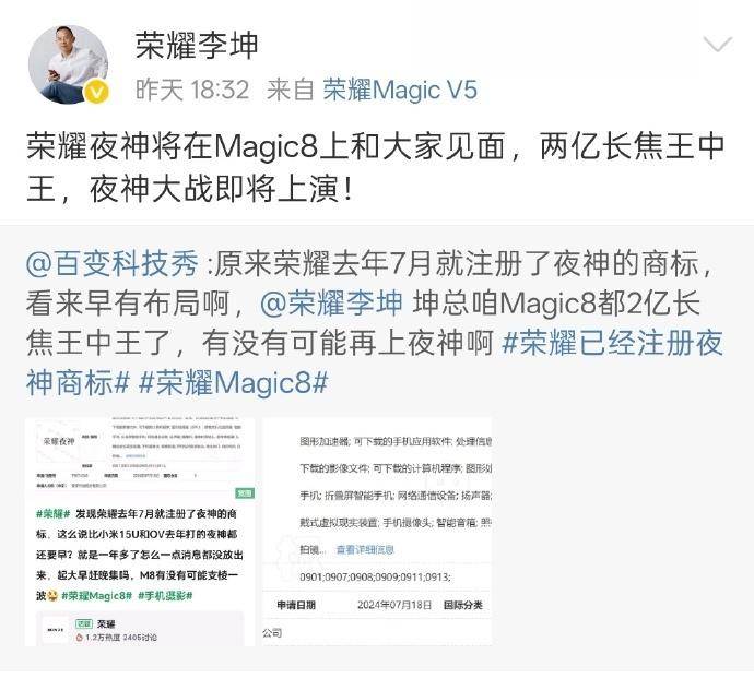 荣耀Magic8系列2亿长焦王中王还将有更多精彩呈现,一起期待。”