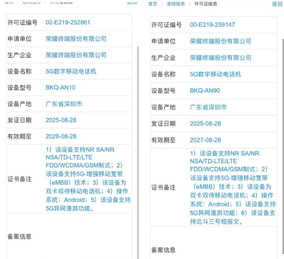 此外,继此前网间爆料了有三款荣耀Magic8系列新机已经入网的消息后,目前,有两款型号分别为BKQ-AN90和BKQ-AN10的荣耀新机也已经获得了国家质量3C认证的消息,据认证信息显示,型号为BKQ-AN90的机型为“双卡双待移动电话机”,并支持北斗短报文功能。而据推测,这两款入网新机大概率来自荣耀Magic8 Pro。